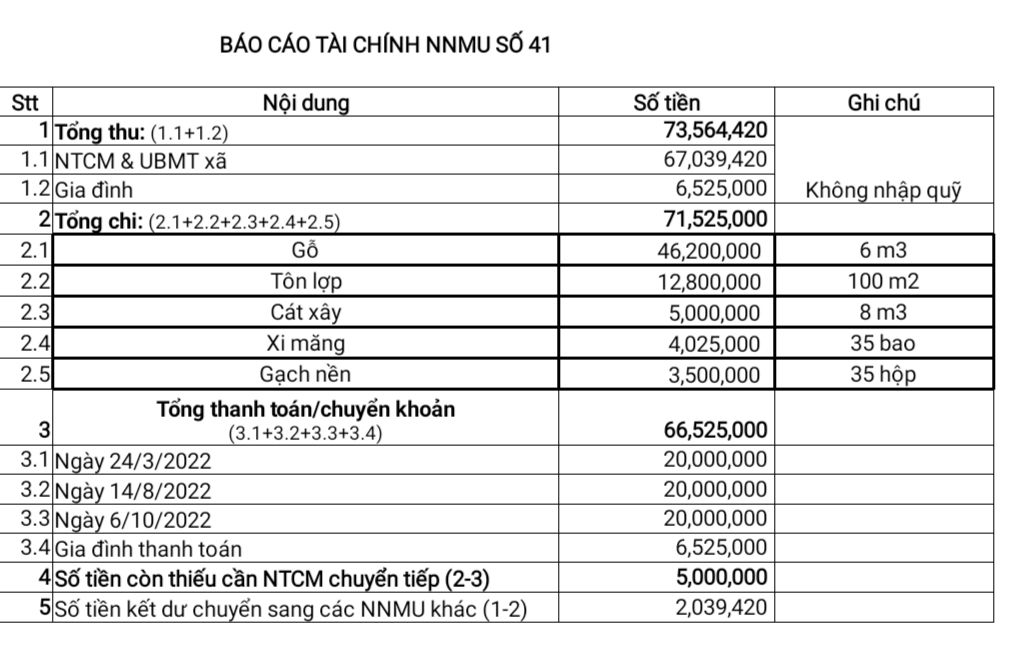 Theo báo cáo thì hiện nay tổng Kinh phí làm nhà 70tr, (bao gồm xã 15r, gia đình 5tr, NTCM 50). Kinh phí xã đã chuyển vào TK NNMU 41 15tr. Và đã chuyển về cho gia đình ứng 2 lần 40tr, vậy còn lại 25tr nữa.