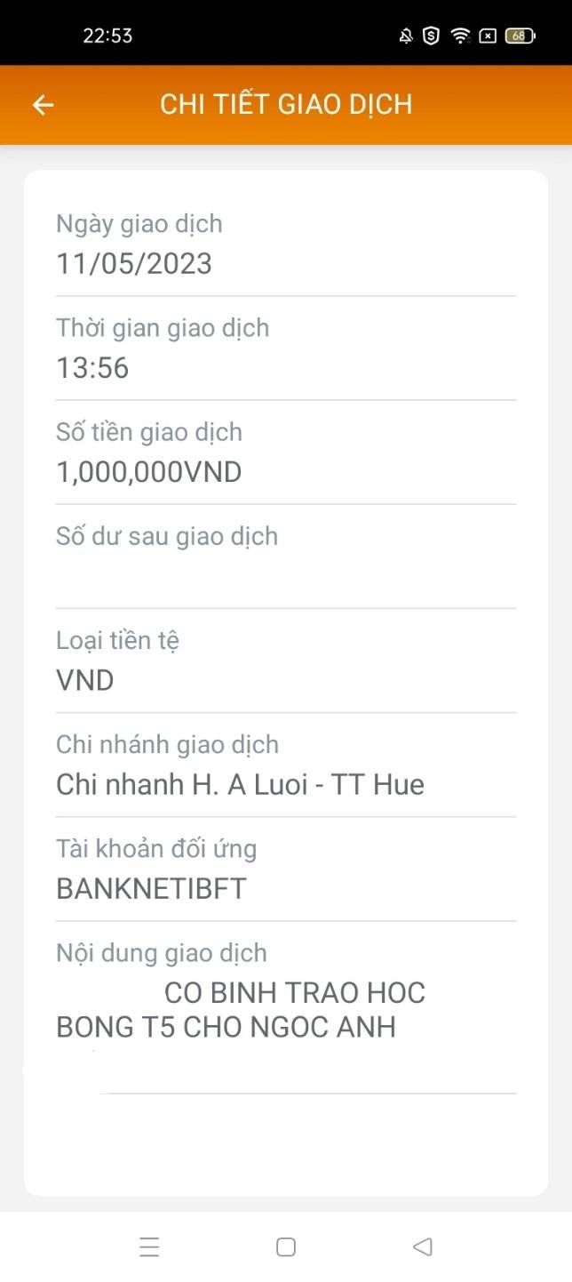 Cháu xin kính chào quý cô chú mạnh thường quân! Hiện tại, cháu đã nhận được học bổng tháng 4 của cô Nguyên và cô Bình trao trị giá 1 triệu đồng. Cháu xin chân thành cảm ơn sự giúp đỡ của các cô chú. Cháu sẽ cố gắng hơn nữa trong thời gian sắp tới ạ!