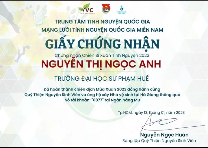 Cháu Ngọc Anh xin chào bác Sáu và các cô chú mạnh thường quân. Cháu đã nhận được học bổng tháng 1, trị giá 1 triệu đồng của cô Nguyên và cô Bình rồi ạ! Cháu xin cảm ơn 2 cô và các cô chú. Cháu kính chúc quý mạnh thường quân sang năm mới thật nhiều sức khỏe, thành công và có thể cưu mang được nhiều hoàn cảnh khó khăn hơn nữa ạ! Cháu sẽ cố gắng học tập, tích cực tham gia các hoạt động nhiều hơn nữa trong thời gian sắp tới.
