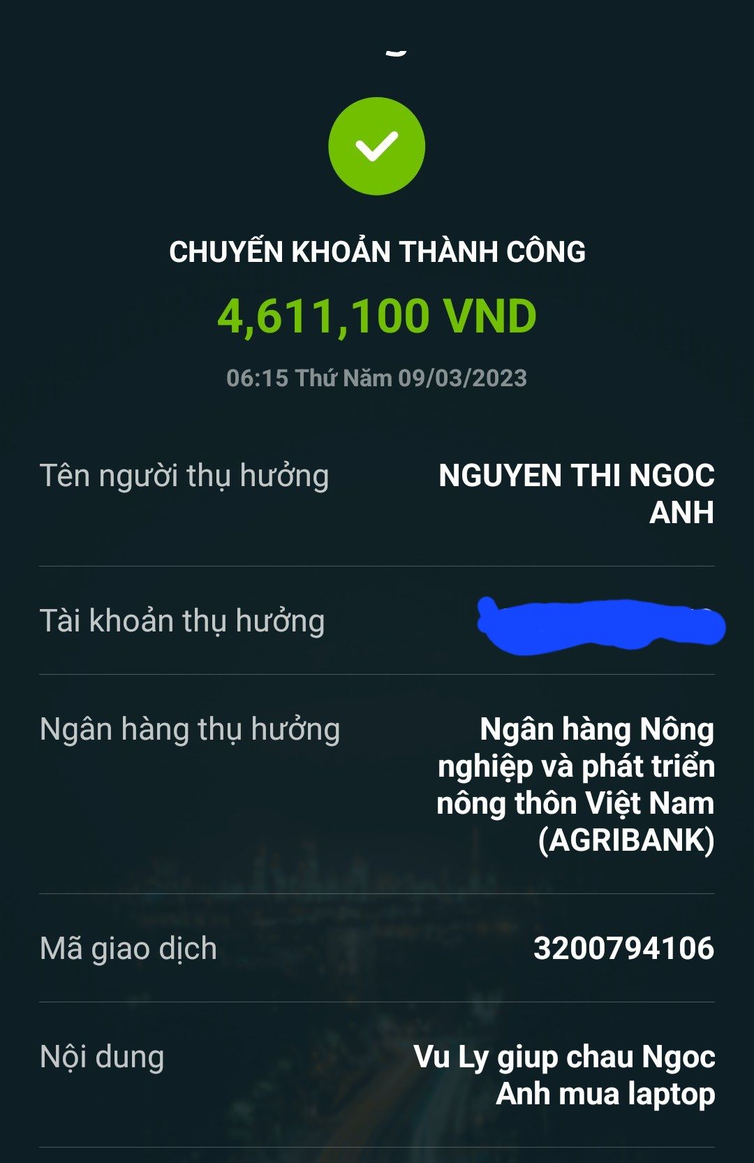 Mình đã chuyển  tiền cho chị lathuvang 4,6 tr để giúp cháu Ngọc Anh mua laptop.  Cảm ơn chị lathuvang và chúc cháu luôn khỏe mạnh và cố gắng học tập.