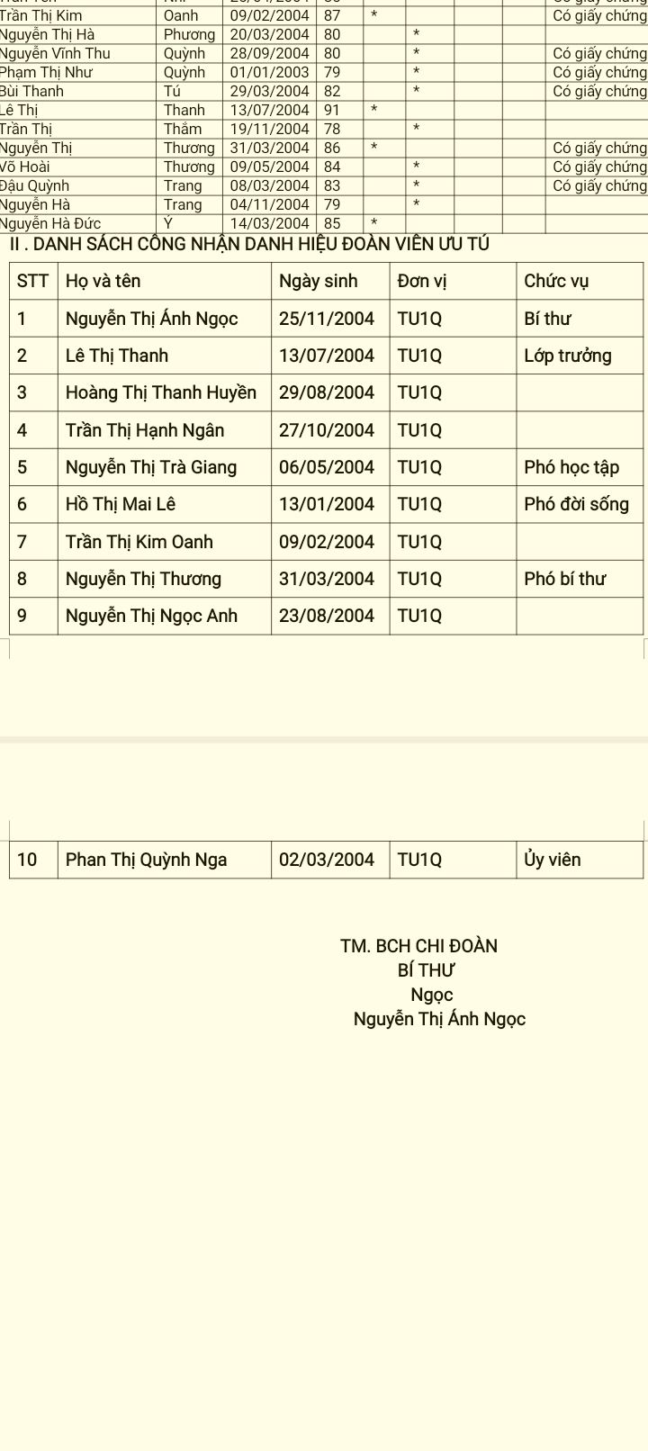 Cháu xin phép cập nhật kết quả học tập HK1 của cháu như bên dưới ạ! Cháu được xét vào 10 đoàn viên ưu tú của lớp và đạt điểm rèn luyện xuất sắc. Bên cạnh đó, qua suốt quá trình cố gắng tham gia các hoạt động của CLB thì cháu có được cấp giấy chứng nhận.