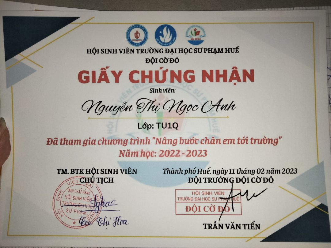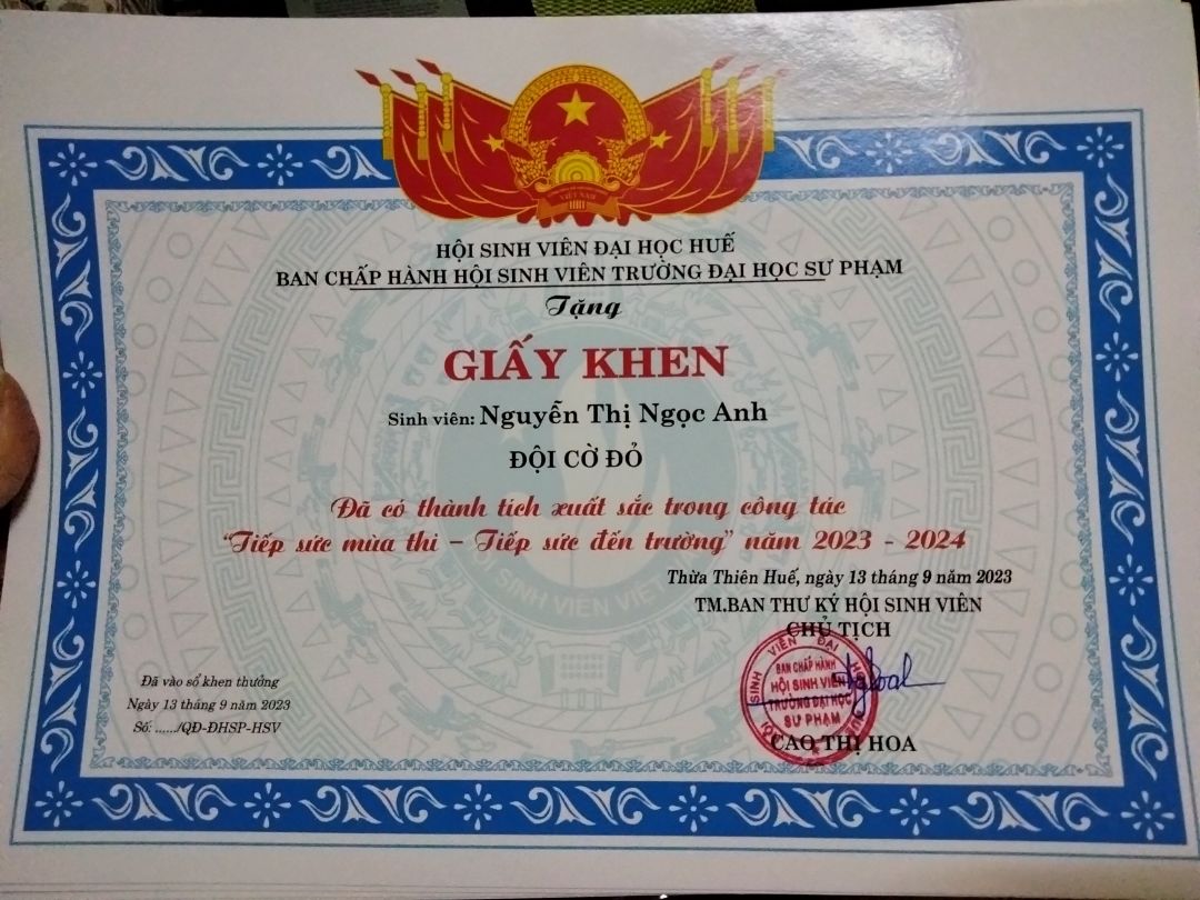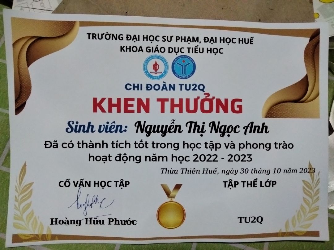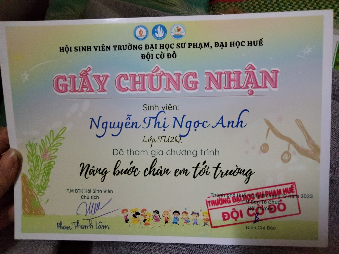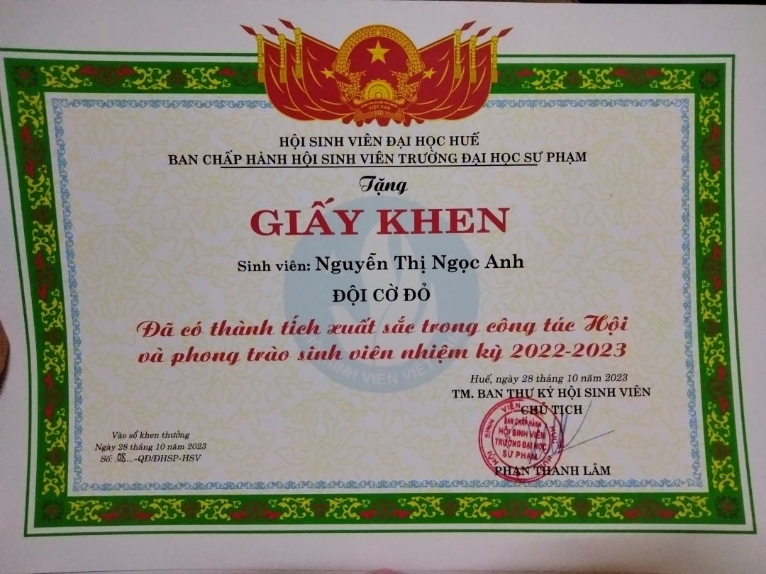 Thời gian qua cháu có tham gia một số hoạt động ở trường, bên ngoài và được cấp một số giấy chứng nhận. Cháu sẽ cố gắng tích cực hơn nữa trong thời gian sắp tới.