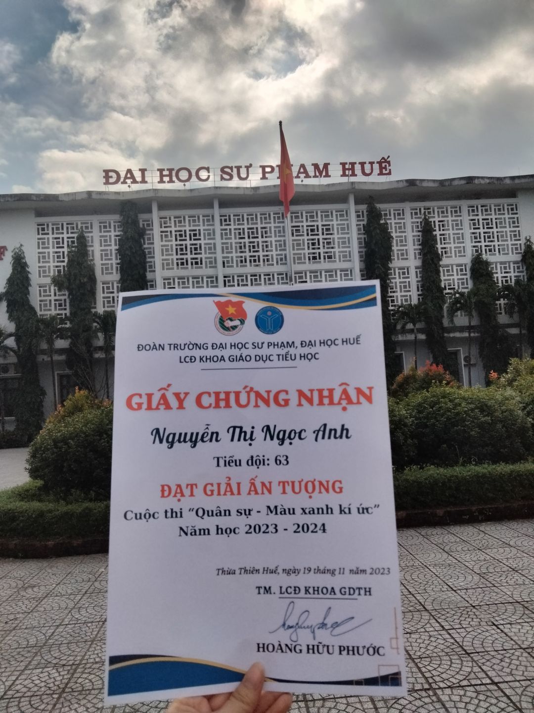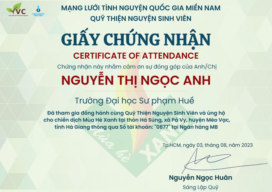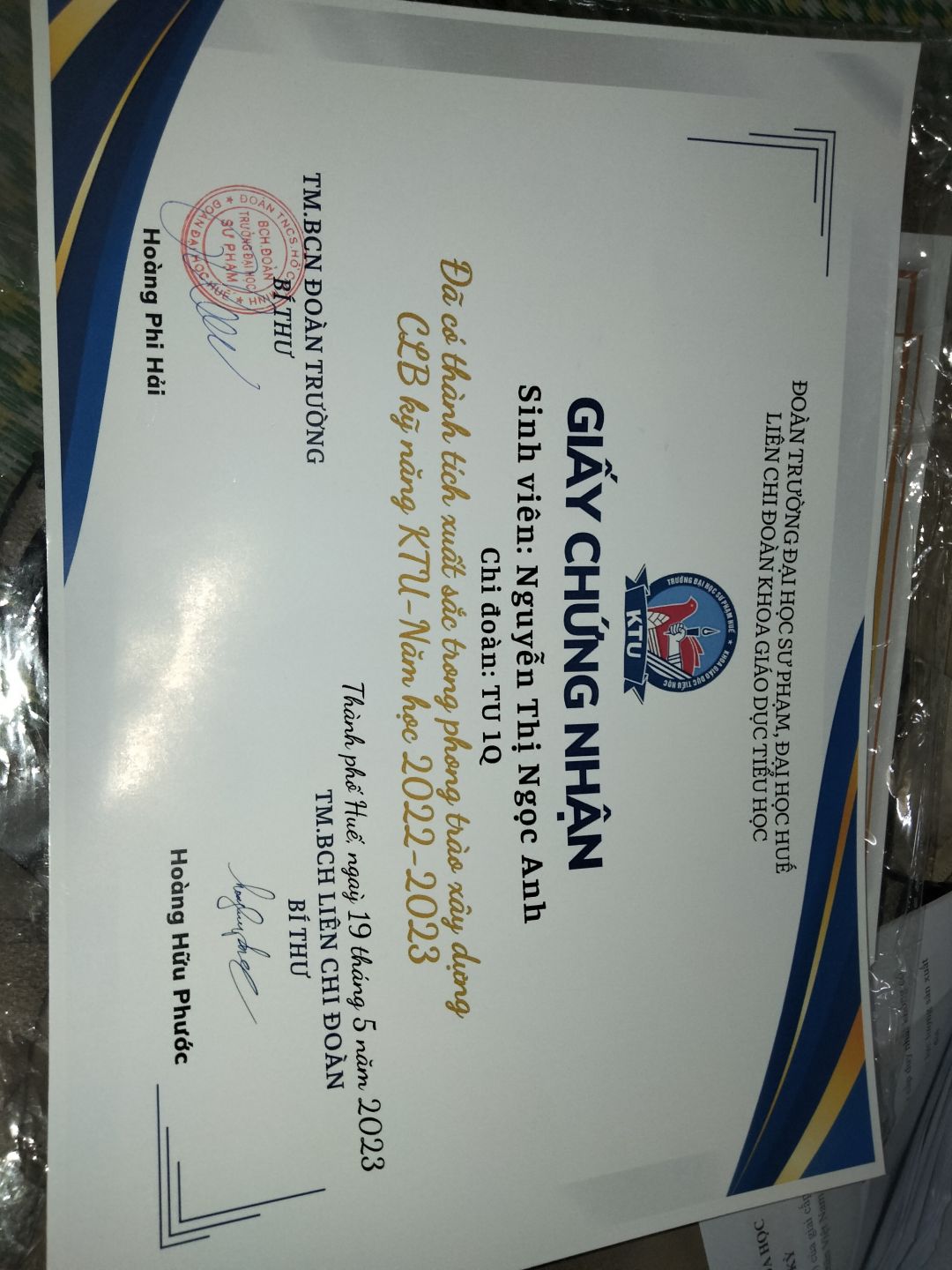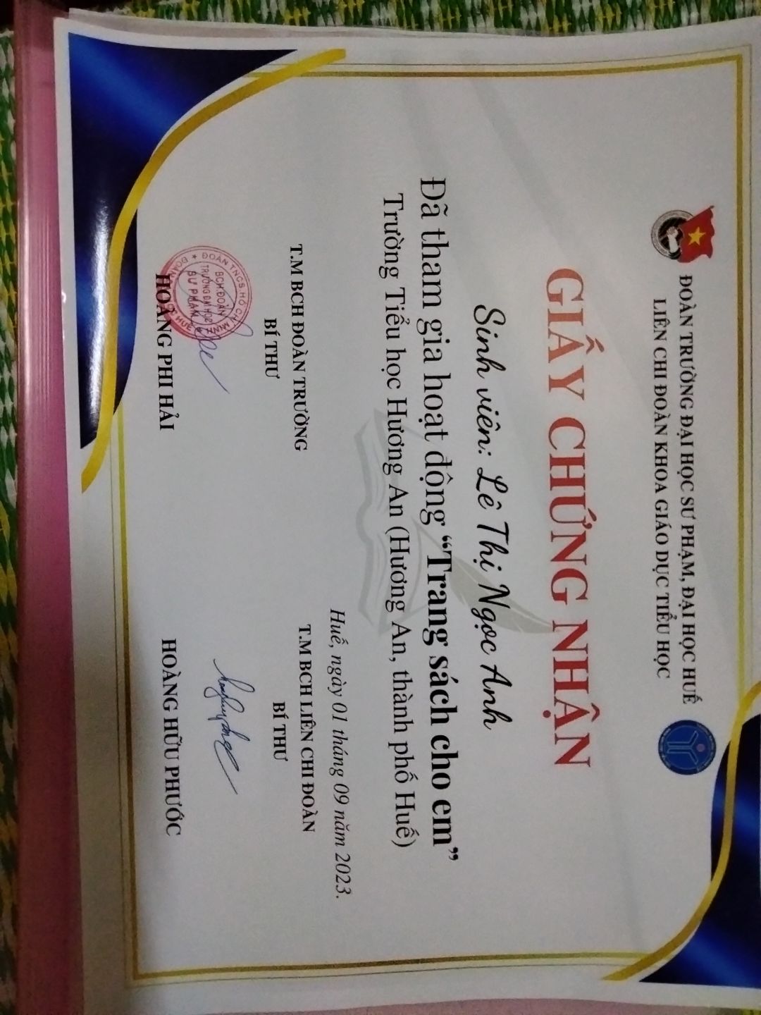 Thời gian qua cháu có tham gia một số hoạt động ở trường, bên ngoài và được cấp một số giấy chứng nhận. Cháu sẽ cố gắng tích cực hơn nữa trong thời gian sắp tới.