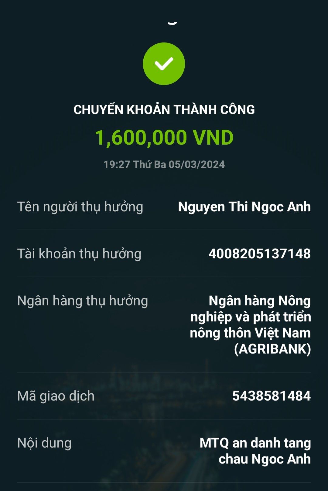 4008205137148 (AGRIBANK, Chủ TK: NGUYEN THI NGOC ANH)