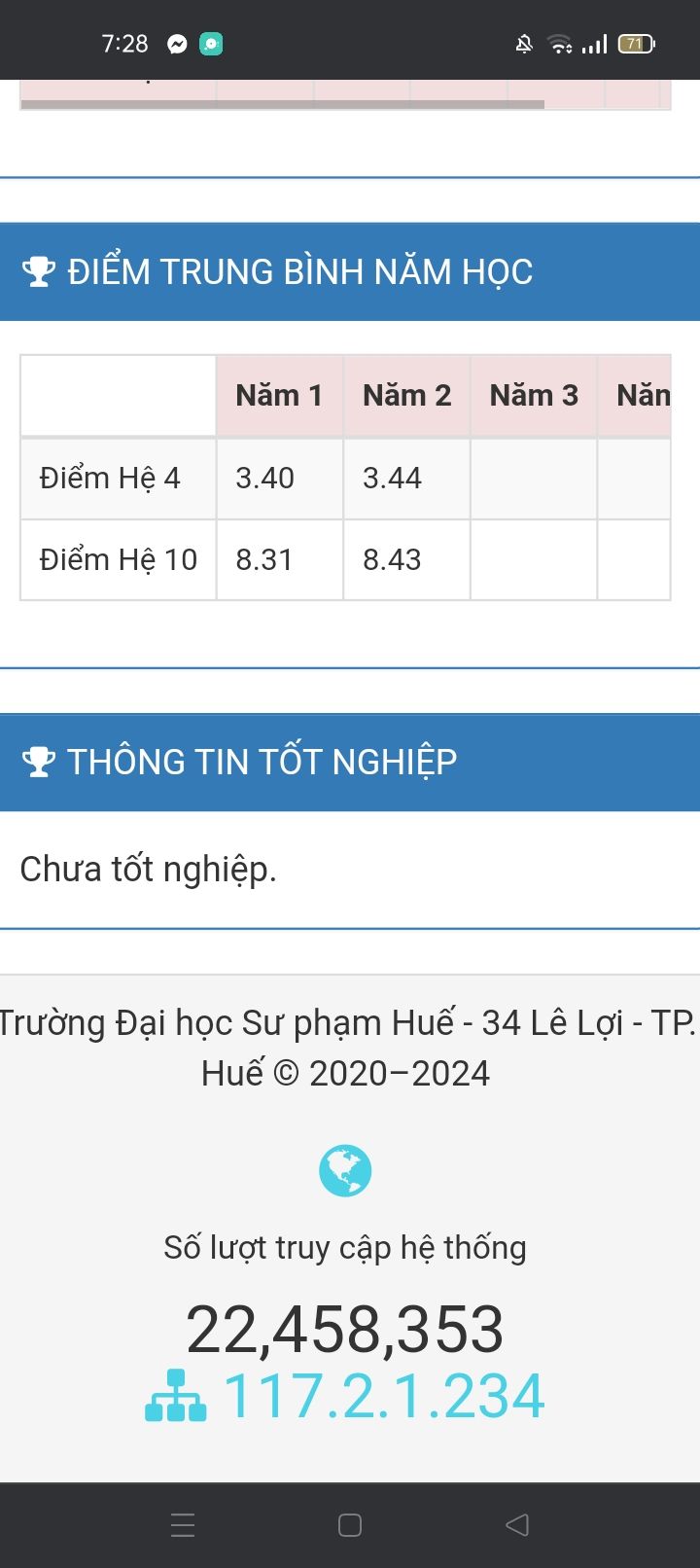 Dạ đây là kết quả học tập và rèn luyện của con trong suốt năm học vừa rồi. Dưới đây là kết quả học tập năm 2 của con, với số điểm này thì còn vẫn đạt danh hiệu "Sinh viên giỏi" trong năm học vừa rồi. Ngoài ra, con còn đạt thành tích 3 kì liên tiếp đạt "Danh hiệu Đoàn viên ưu tú".