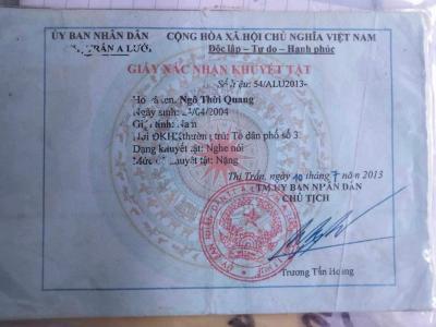 Gia đình em Ngô Thời Quang là gia đình thuộc hộ nghèo. Địa chỉ : Tổ dân phố 3, Thị Trấn A Lưới, Huyện A Lưới. Gia đình gồm 8 thành viên và có 4 thế hệ có đang cùng sinh sống. Tuy nhiên cả gia đình đều bị khuyết tật về nghe và nói. Trong nhà Quang chỉ có Quang nói khá rỏ, còn lại ông, mẹ, anh, chị và các cháu đều nói không rỏ.