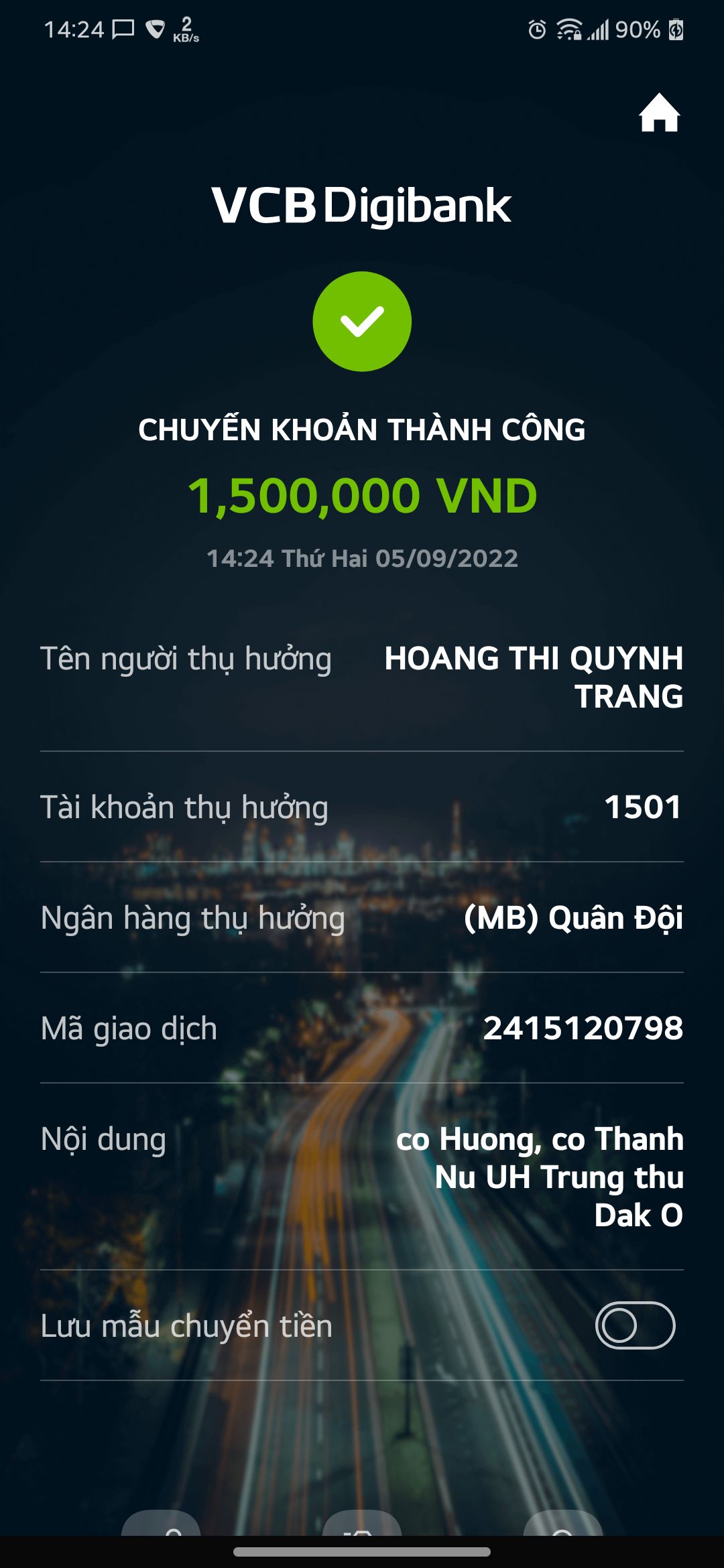 Letuantu đã chuyển tiền cô Hương (1000,000đ), cô Thánh Nữ (500,000đ) vào tài khoản thủ quỹ.
