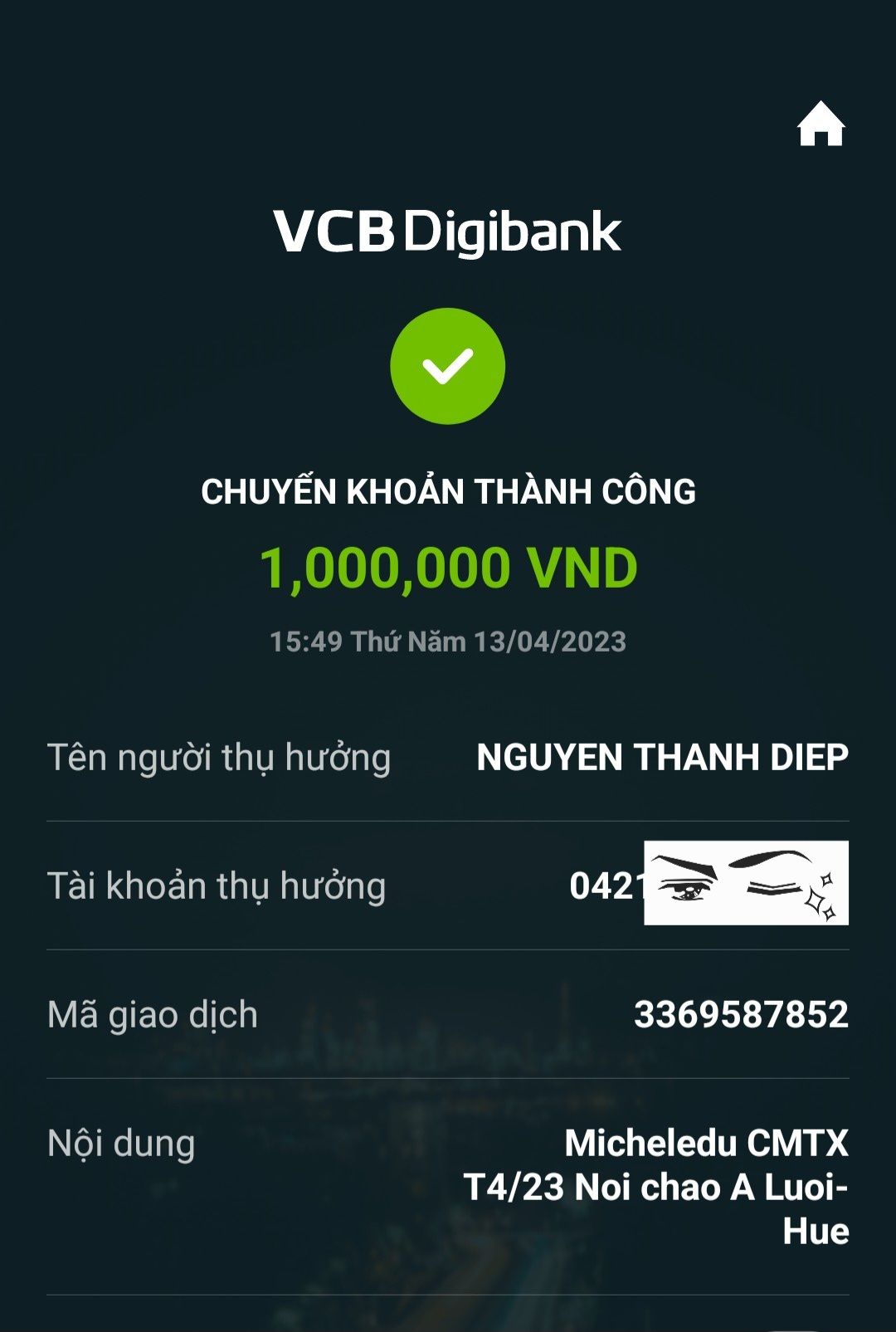 Và đã chuyển Wendy Dương 10 triệu ( trong đó 5 triệu để mua sắm thêm vật dụng còn thiếu, còn 5 triệu là kinh phí để đi chợ hàng tháng).