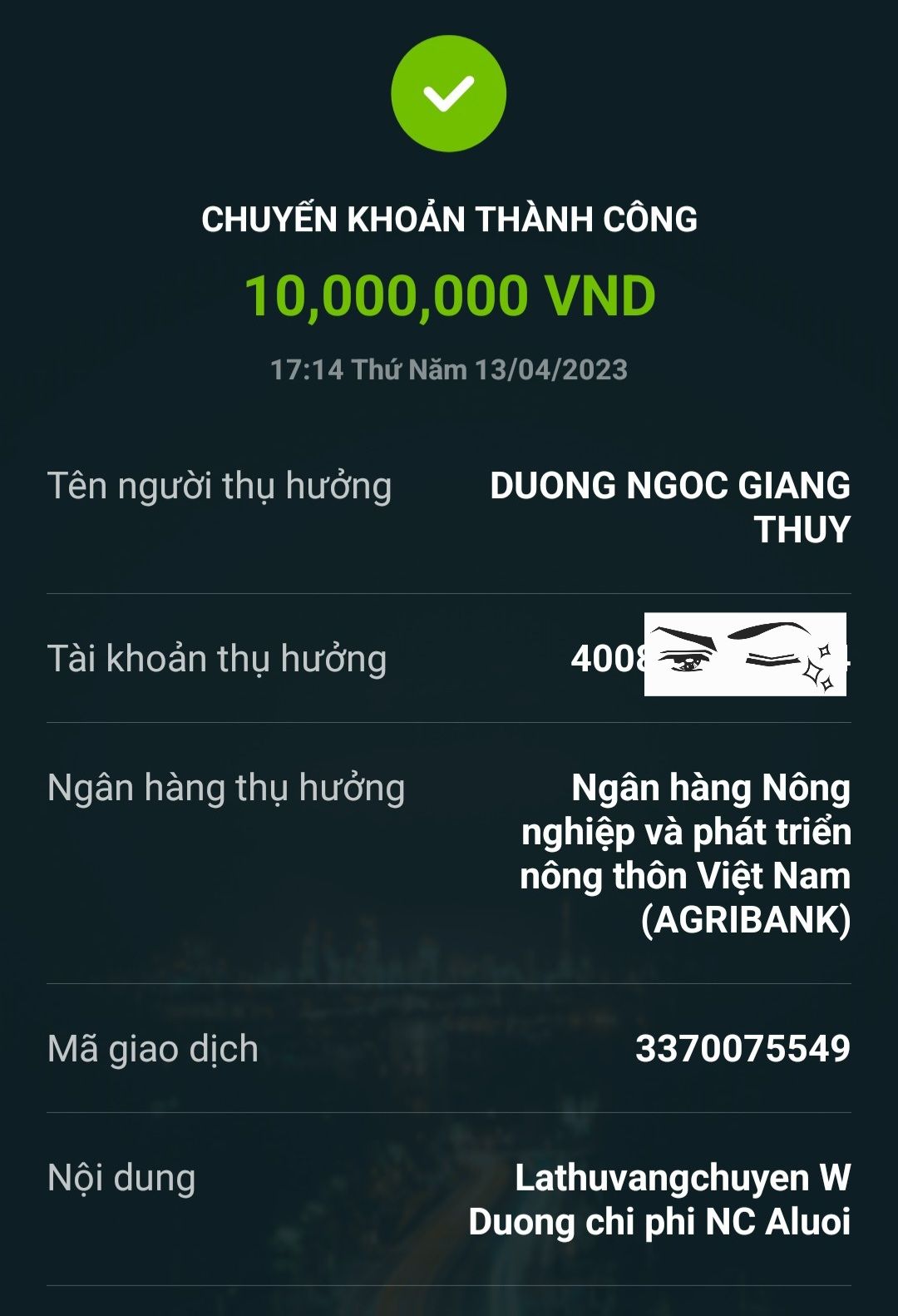 Và đã chuyển Wendy Dương 10 triệu ( trong đó 5 triệu để mua sắm thêm vật dụng còn thiếu, còn 5 triệu là kinh phí để đi chợ hàng tháng).