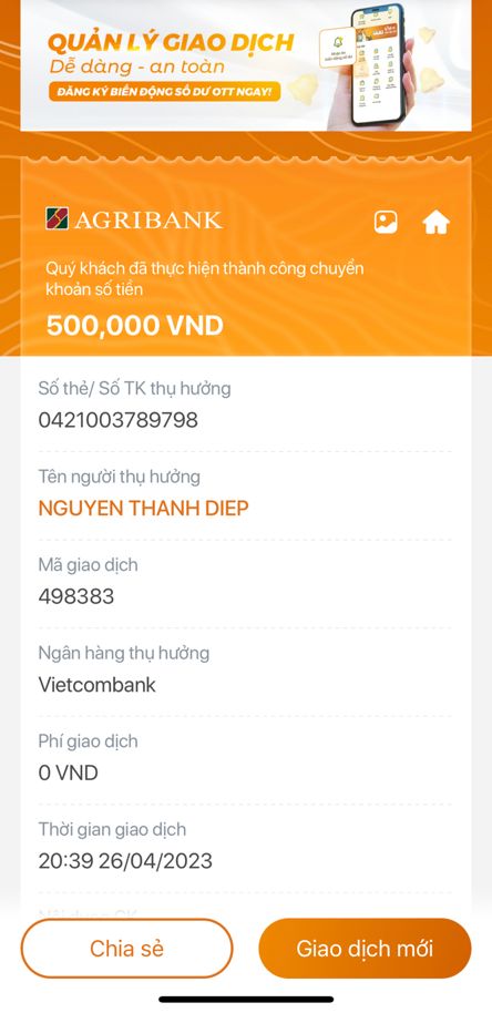 Bạn em Wendy là em An Yên có ủng hộ 500.000 đ cho nồi cháo A Lưới. An Yên nhờ em Wendy ck cho chị Diệp ạ