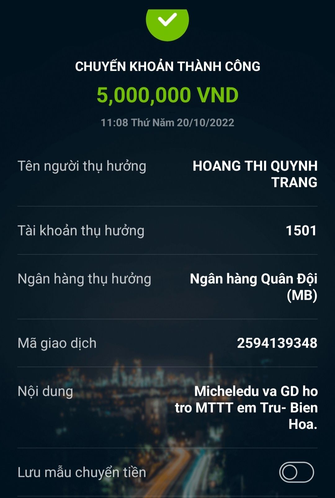 Lathuvang đã trung chuyển tk Quỹ NTCM 5 triệu hỗ trợ MTTT em Trụ của Michele_du và GĐ.