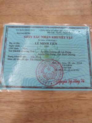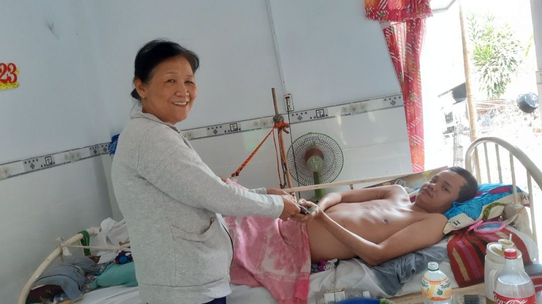 Em Lê Minh Tiền sinh năm 1990 bị tai nạn lao động điện giật và té chúi đầu vào hố móng trên công trình xây dựng năm 2013, bị gãy cột sống cổ liệt tứ chi, tính đến này em đã nằm một chỗ đã chín năm rồi. Tình trạng sức khỏe vẫn y như cũ  nếu không nói càng ngày càng tệ hơn với những biến chứng một tuần phải uống thuốc mới đi cầu được vết loét thì không thể lành được tay chân co quắp, các khớp háng và cột sống do không được ngồi xe lăn thường xuyên nên đã bắt đầu dính lại, vừa rồi lại bị gãy trật nữa và bây giờ vướng cái bịch nước tiểu nên không thể lên xe lăn nữa được rồi. Như trên hình mình đưa lên hai chân em đều bị cột giống như người tù khổ sai vậy đó