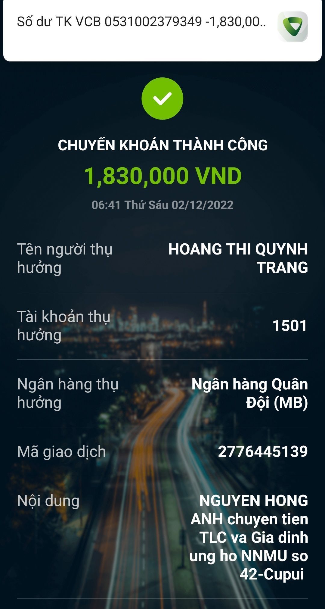 Chị em nhà Sahara ủng hộ việc xây dựng NNMU số 42 cho các cháu 1,000,000₫ ( đã chuyển tiền về quỹ NTCM )