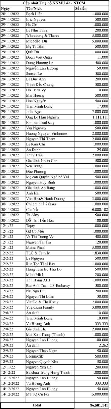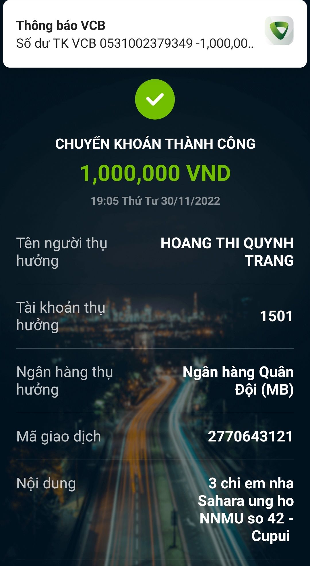 Chị em nhà Sahara ủng hộ việc xây dựng NNMU số 42 cho các cháu 1,000,000₫ ( đã chuyển tiền về quỹ NTCM )