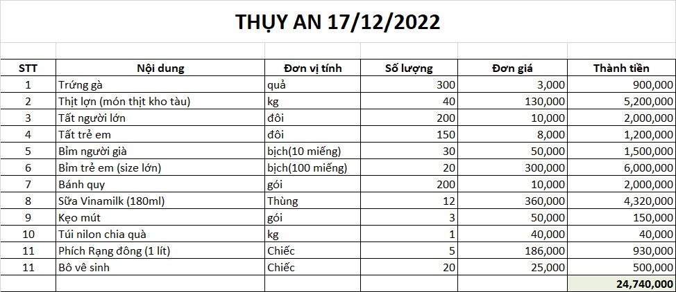 Năm nay Tết sắp cận kề, với mong muốn bữa cơm của họ có chút thịt và nhận được sự hỗ trợ của Chef Nguyễn Văn Khu cũng như các thành viên tình nguyện của trường Bách khoa, thời gian không còn nhiều nên nhóm quyết định ngày 17/12/2022 sẽ thực hiện một chương trình nho nhỏ. Với kinh phí khoảng 25 triệu đồng.