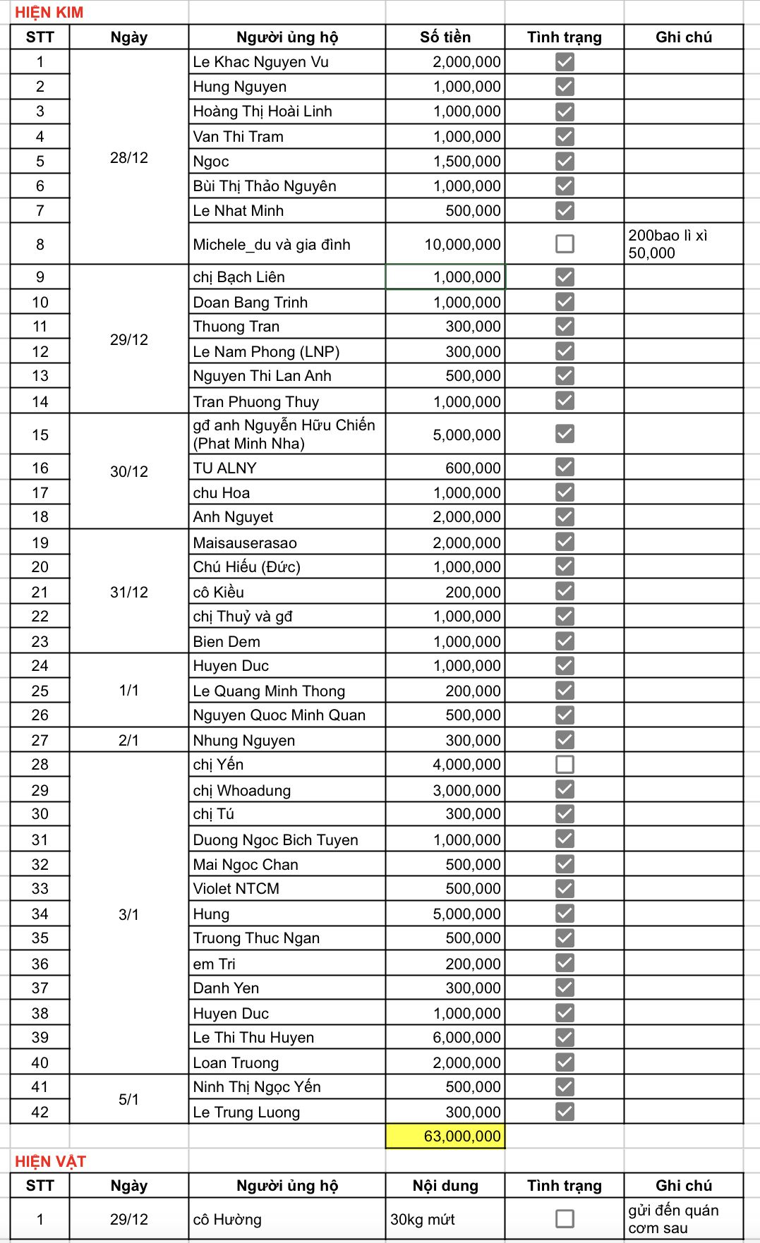 dạ xin phép các anh chị, em xin cập nhật tiếp thông tin ủng hộ của mọi người tính đến 12h trưa ngày 2/1 để cả nhà tiện theo dõi ạ