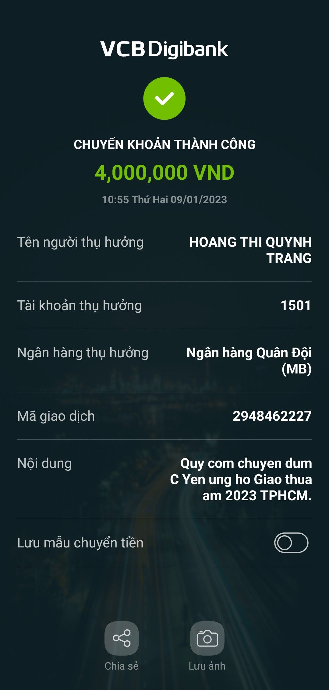 Lathuvang đã trung chuyển tk NTCM 4 triệu ủng hộ Giao thừa ấm TPHCM qua quỹ quán cơm SG của chi Yến.