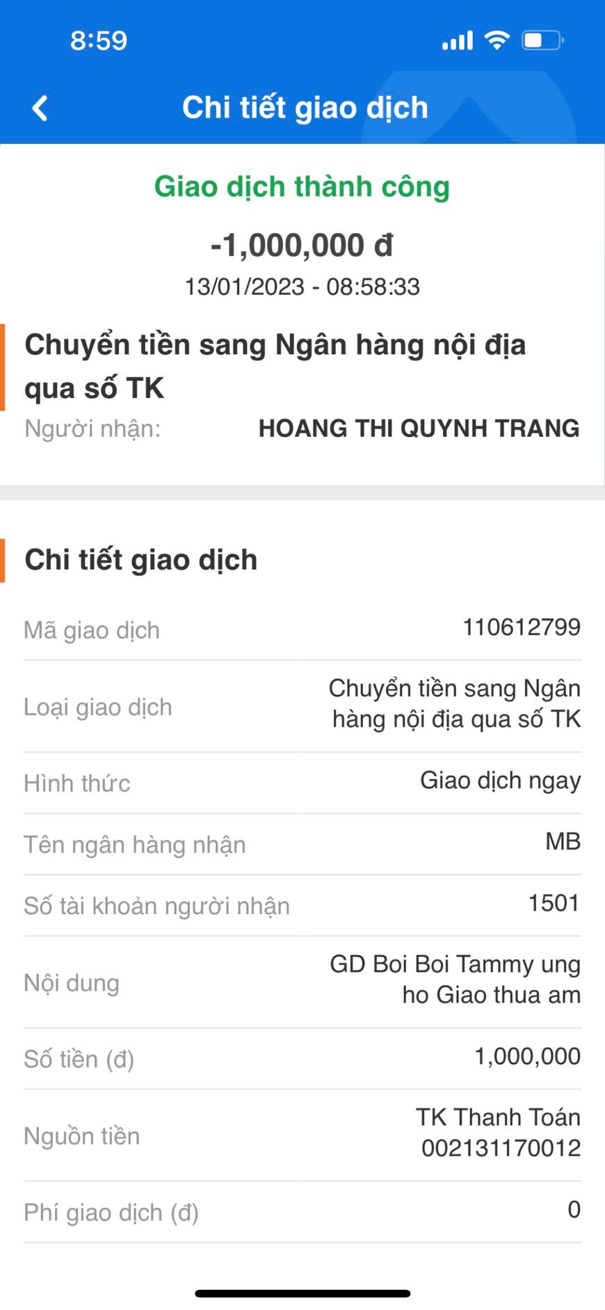Do gia đình Michele_du ủng hộ trực tiếp sẽ gửi 10,000,000đ bao lì xì đến chương trình nên Loannguyen đã chuyển 10,000,000đ vào quỹ rồi ạ!