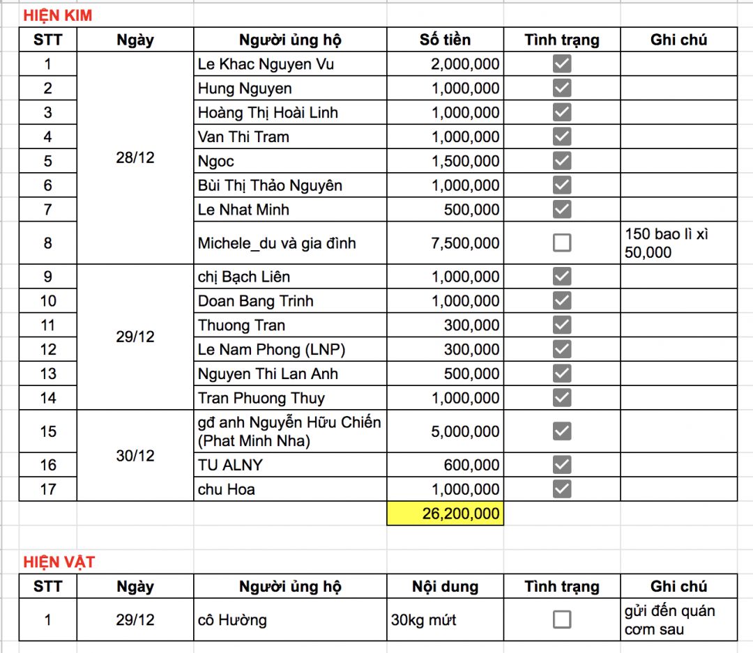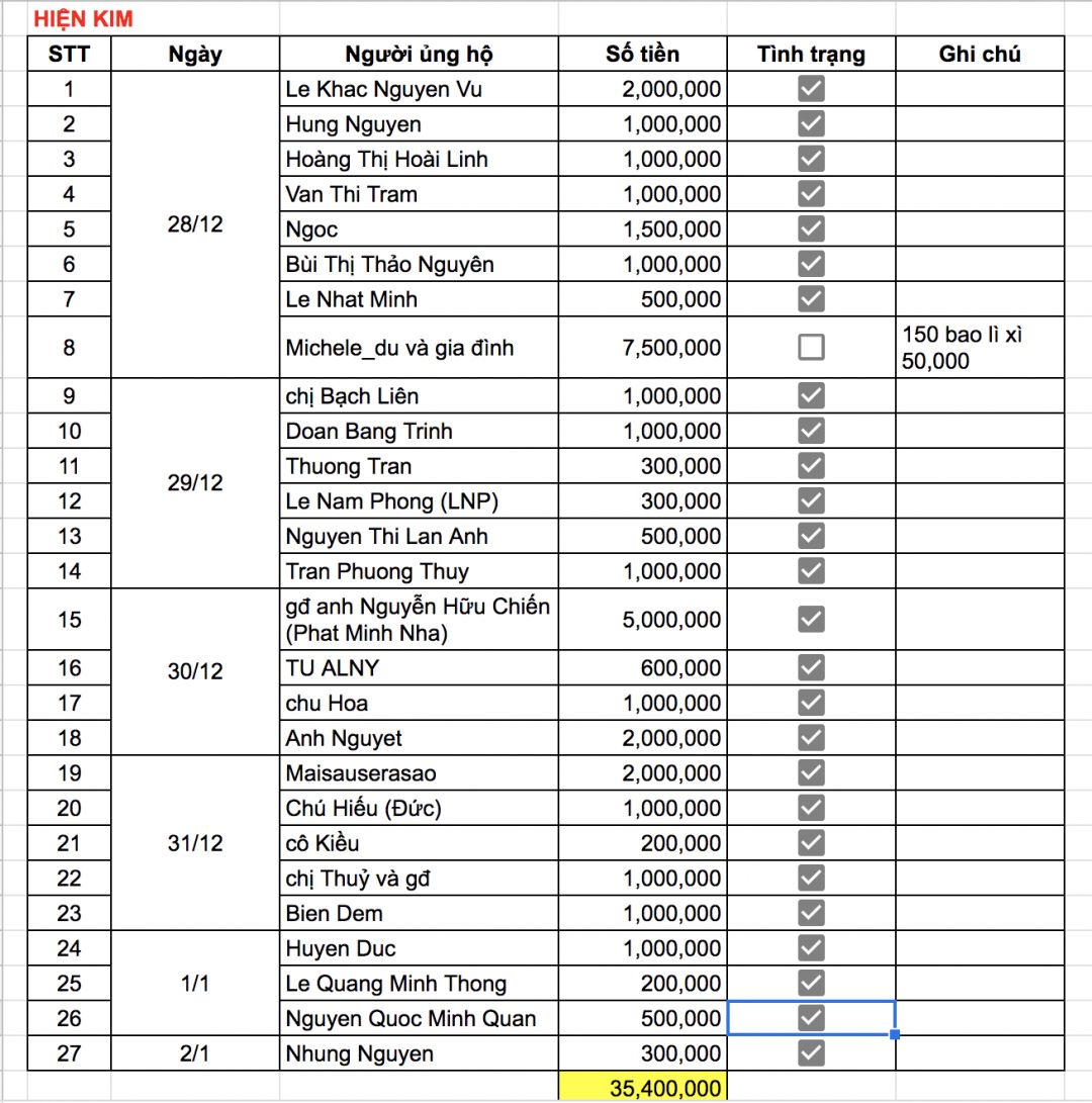 dạ xin phép các anh chị, em xin cập nhật tiếp thông tin ủng hộ của mọi người tính đến 12h trưa ngày 2/1 để cả nhà tiện theo dõi ạ