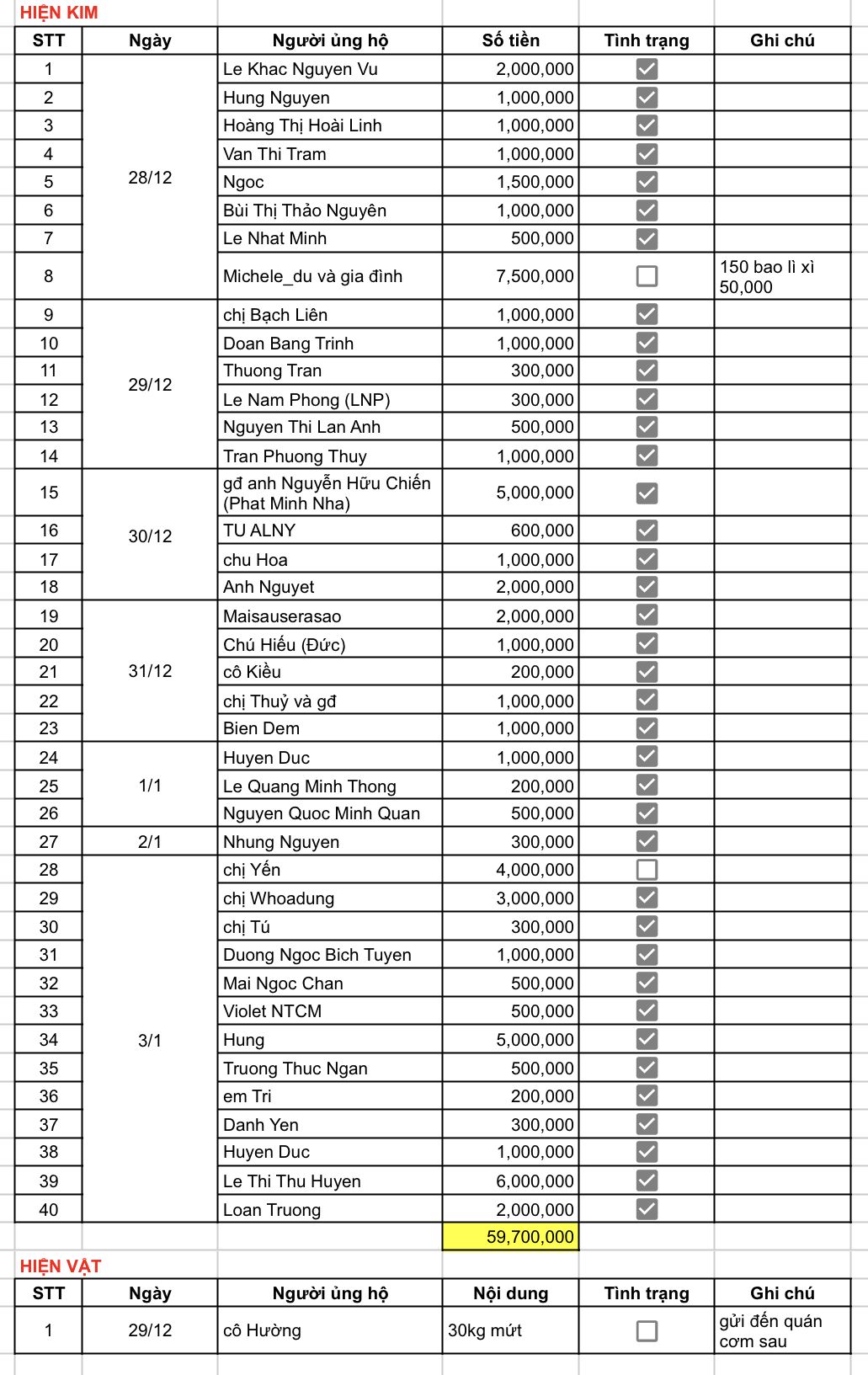 dạ xin phép các anh chị, em xin cập nhật tiếp thông tin ủng hộ của mọi người tính đến 12h trưa ngày 2/1 để cả nhà tiện theo dõi ạ