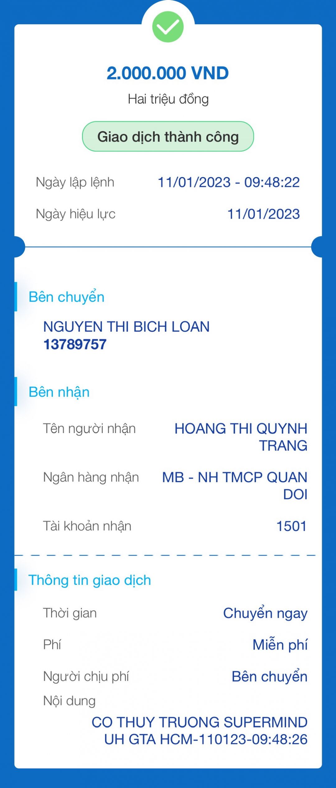 Cô Thu Thuỷ giáo viên trường SuperMind đóng góp 2,000,000đ góp tiền mua bánh Tét cho bà con. Loannguyen đã nhận và chuyển vào quỹ nhé.
