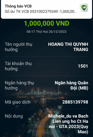 - Mọi đóng góp xin gửi về tài khoản NTCM số 1501 - MB Bank Hoàng Thị Quỳnh Trang; Xin vui lòng ghi rõ theo cú pháp “Anh/chi ung ho GTA HN 2023”