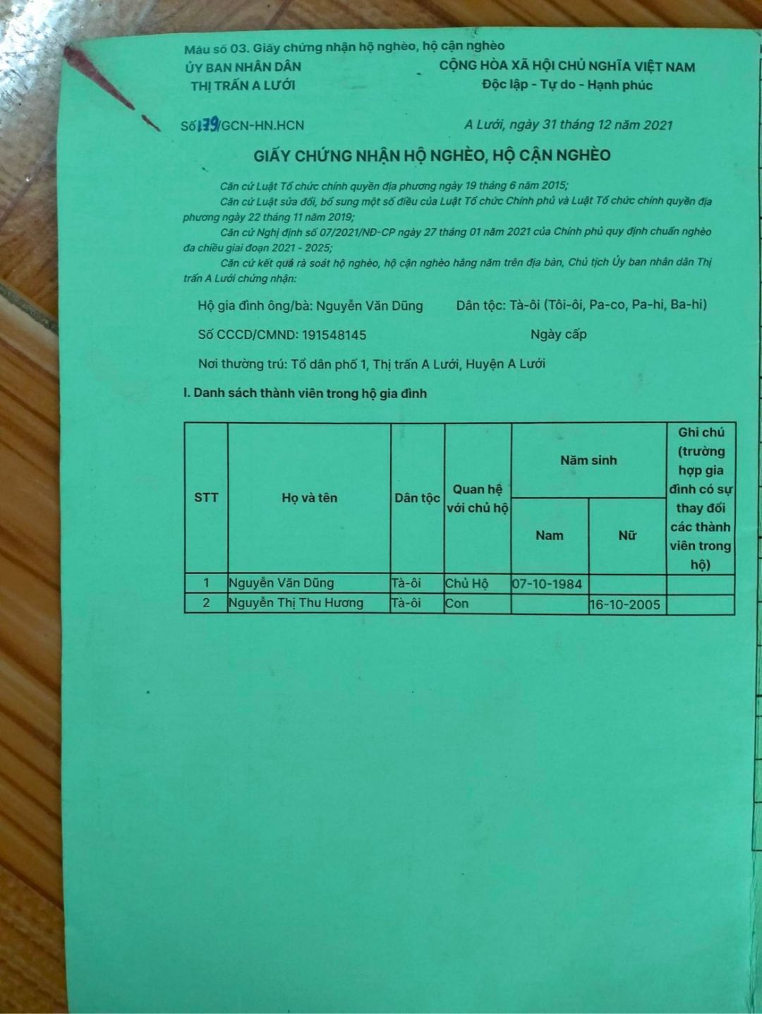 Hoàn cảnh này đã lên lịch xác minh từ 15/4 nhưng vẫn chưa thực hiện được. Không biết ở A Lưới có bạn nào thu xếp được xác minh sớm cho cả nhà biết thông tin nha.