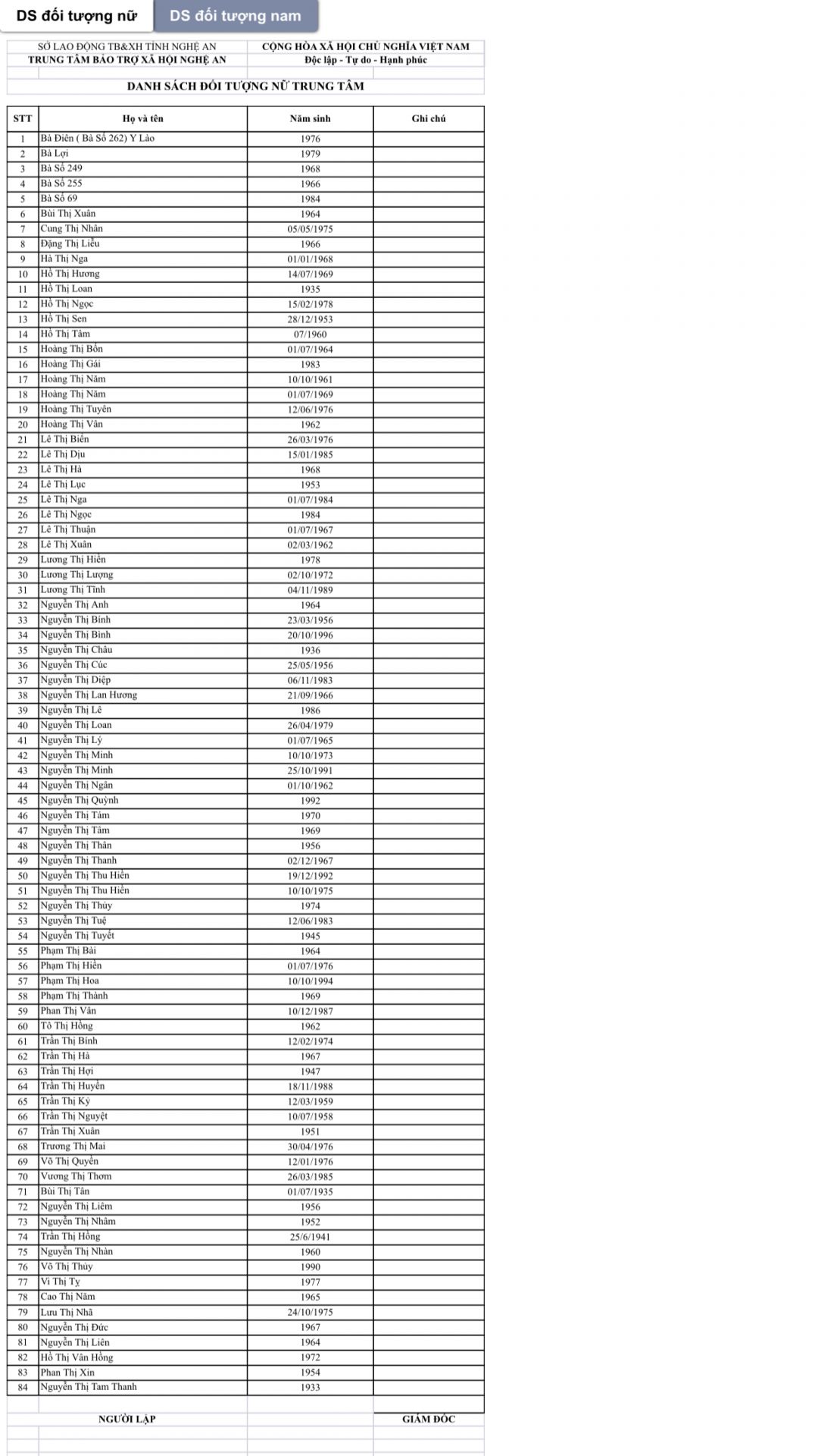 Cảm ơn các bạn đã bổ sung đầy đủ danh sách nhân khẩu đang được chăm sóc tại Trung tâm Bảo trợ XH Tỉnh Nghệ An.