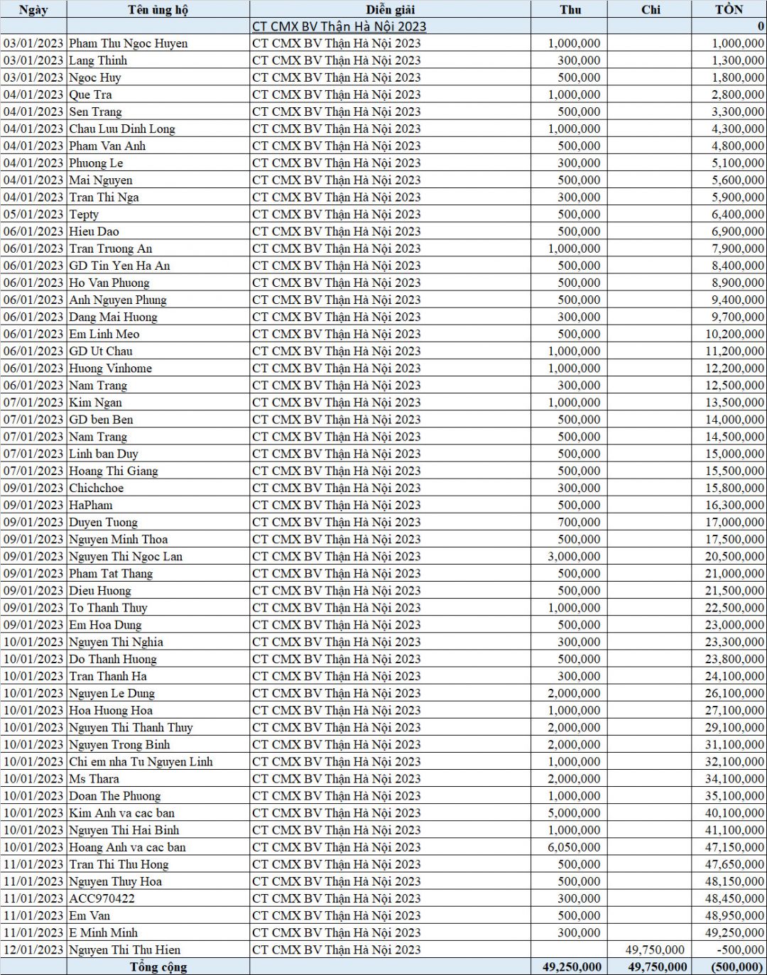Đúng là tâm khởi trùng trùng duyên khởi, tính đến 15.00 ngày 12/01/23 quỹ NTCM đã nhận được UH bằng hiện kim của 53 mạnh thường quân với tổng số tiền là 49.750.000 đ