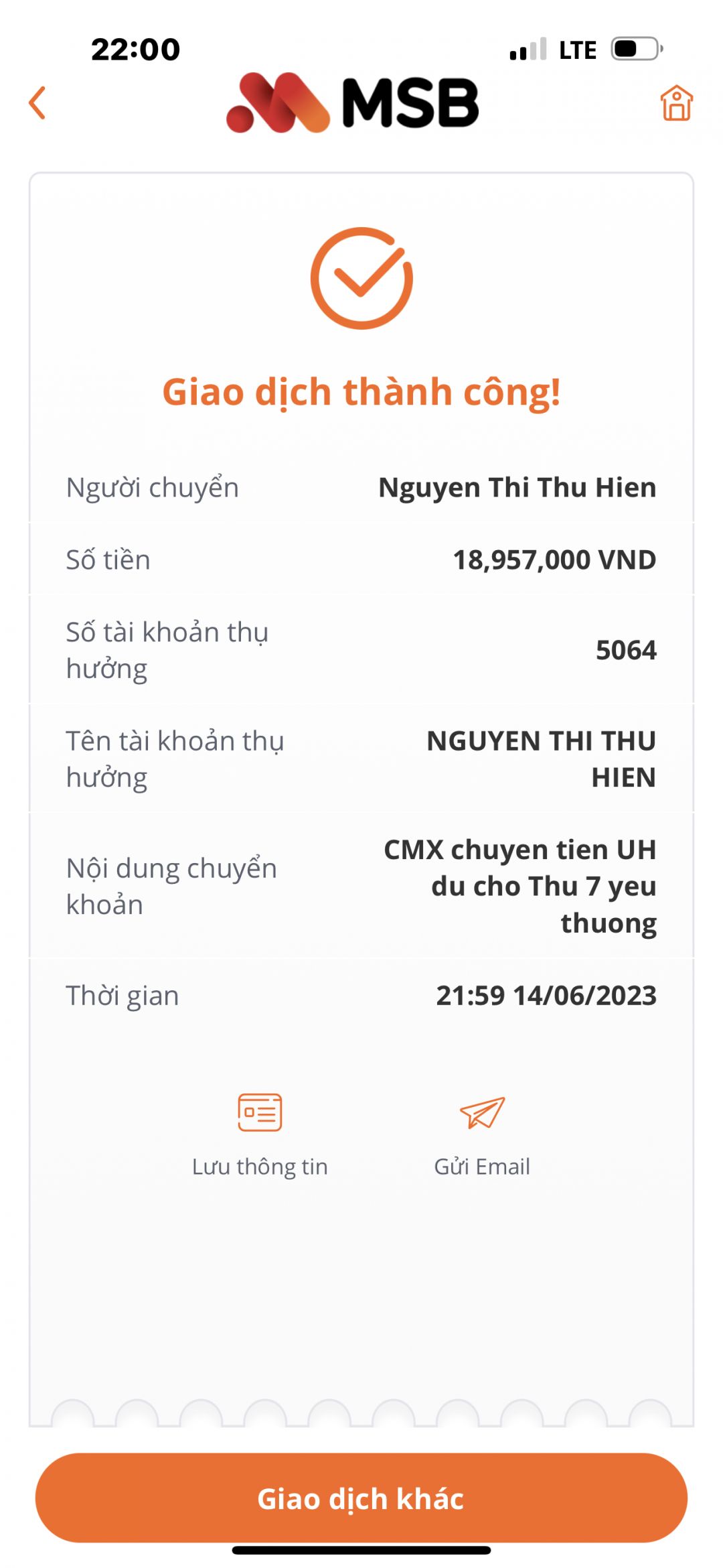 Vịt đã chuyển 49.750.000đ vào tài khoản Hiền Linh. Cảm ơn anh banbe6x.