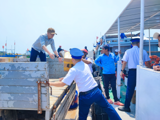 Mọi người đã ra đến đảo, đội cảnh sát biển hỗ trợ chuyển 100 thùng quà lên điểm trường và trạm y tế