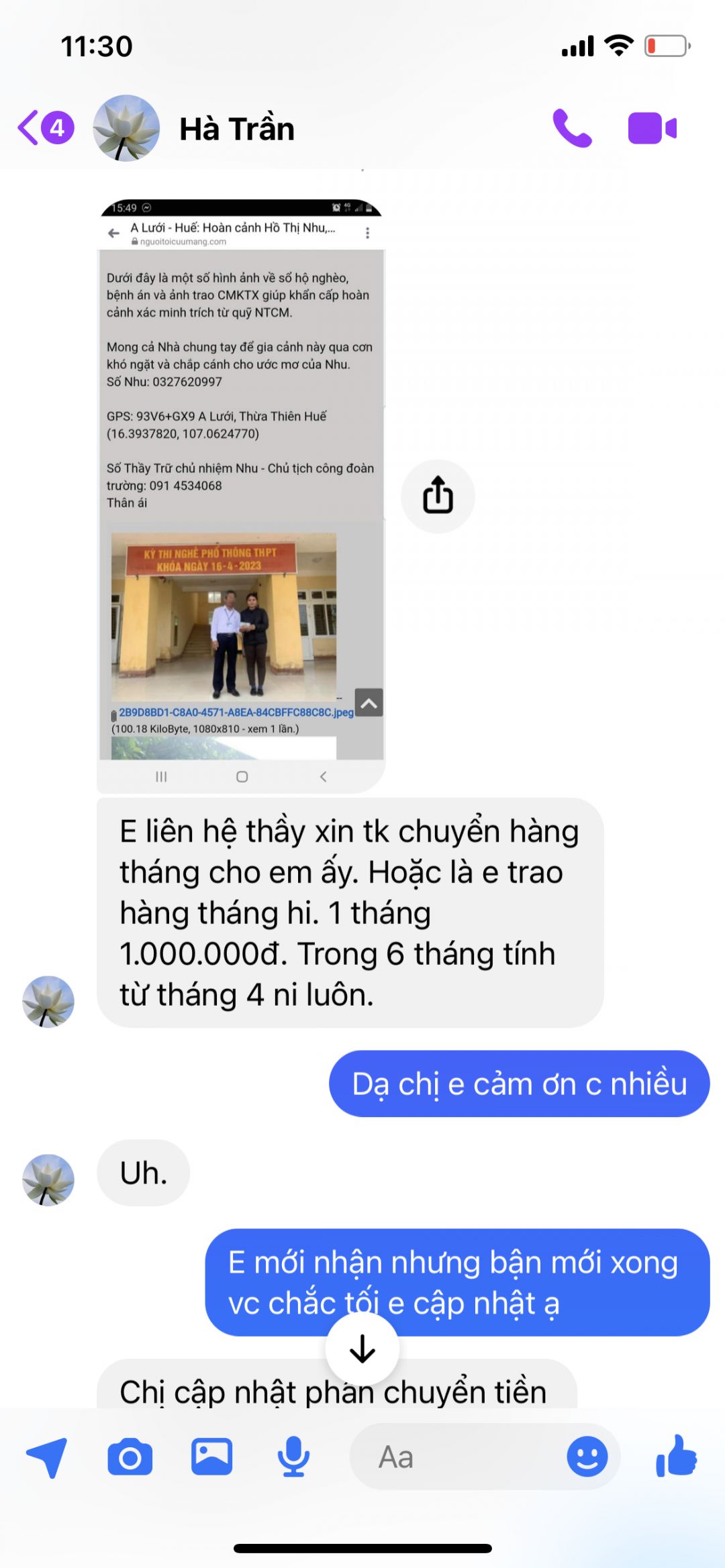 Tiền trao hàng tháng 1 triệu em sẽ ck trực tiếp hàng tháng cho em Nhu. Nếu nhu yếu phẩm tự mua bằng tiền mặt thì em sẽ nhờ gv của em Nhu mua giúp và trao   ( cô Mai Đặng 0973882142)