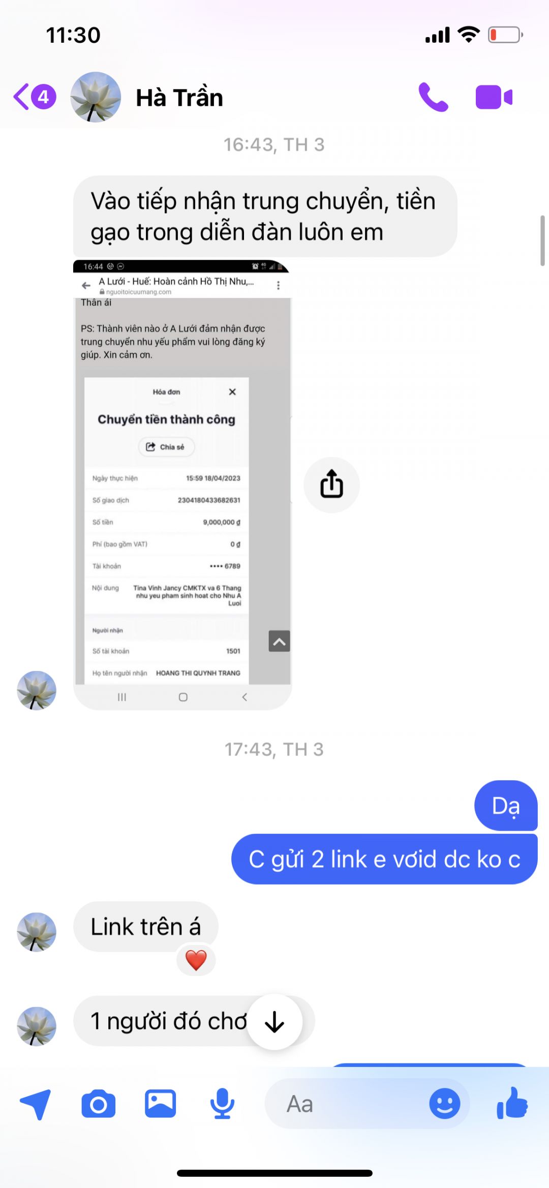 ạ nhưng việc ni chị Trần Hà đã chuyển khoản và ghi rõ tên em nhận trung chuyển và trao hàng tháng thì