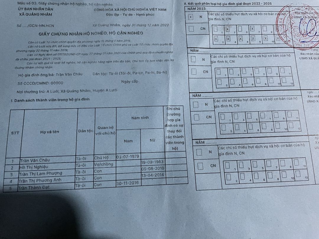 Gia đình anh Trần Văn Châu sinh năm 1979 ở Thôn A Lưới Xã Quảng Nhâm Huyện A Lưới Tỉnh Thừa Thiên Huế.