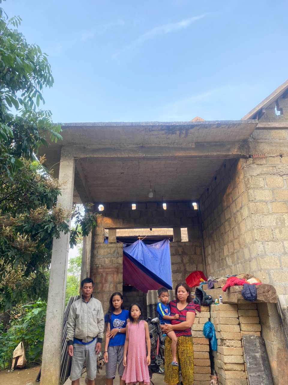 Gia đình anh thuộc diện nghèo bền vững. cách đây  gần 10 năm gia đình anh được nhà nước hỗ trợ một ngôi nhà trị giá 50 triệu, cứ nghỉ là sẽ làm thêm vay chút ít của ngân hàng chính sách để làm cho ngôi nhà được tươm tất nhưng không may trong khi làm thuê anh bị tai nạn lao động mất sức, không còn khả năng làm thuê nhà thì chưa xong  chỉ lợp tạm chỗ ngủ còn bếp củi che bạt tạm bợ nợ ngân hàng thì tới hạn gia đình không đủ khả năng trả .