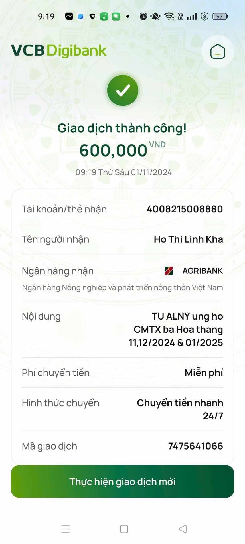 Cảm ơn anh chị TU ALNY chúc gia đình anh chị luôn bình an may mắn hạnh phúc ạ. Em đã nhận 600.000đ cho tháng 8,9,10 của anh chị rồi ạ. Biết ơn rất nhiều 🍀