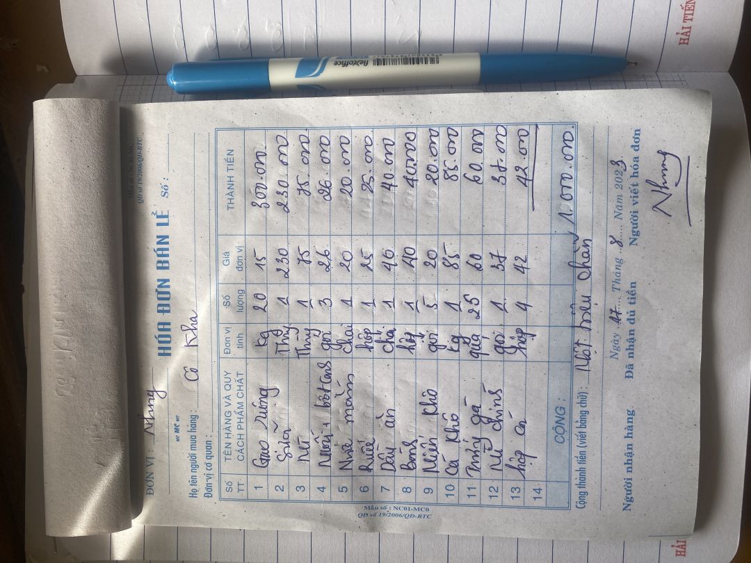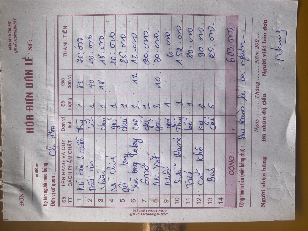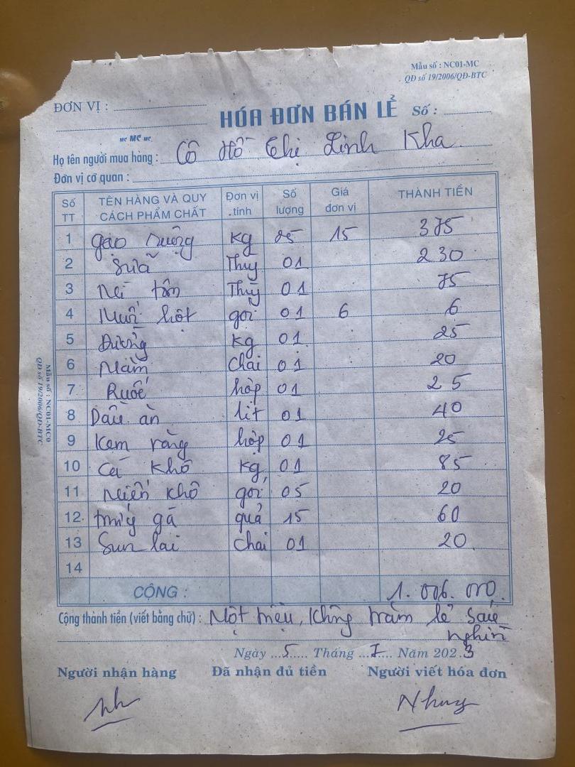 Hôm nay em trao nhu yếu phẩm tháng 10/2023 là 1 triệu đồng trong đó em mua nhu yếu phẩm là 603.000đ tiền mặt là 400.000đ tổng số tiền làm tròn là 1.000.000đ