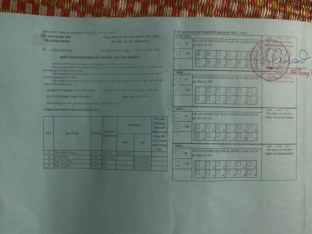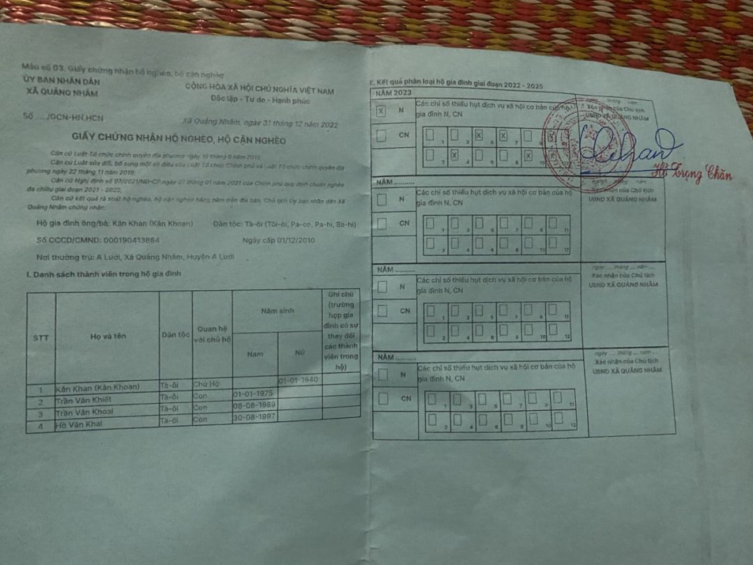 Bà Kăn Khoan 83 tuổi goá phụ già yếu ở thôn A lưới Xã Quảng Nhâm huyện A lưới Tỉnh thừa thiên Huế gia đình bà thuộc hộ nghèo khó khăn nhất vùng. Bà sống cùng bốn đứa con, ba đứa con bị câm điếc,  một đứa bị tâm thần và có đứa con dâu bị thiểu năng. Gia đình sống qua ngày nhờ làm thuê trong xóm kêu gì làm đó. Cuộc sống gia đình vô cùng khó khăn và chật vật. Kính mong quý MTQ giúp đỡ gia đình bà. Tôi xin chân thành cảm ơn!