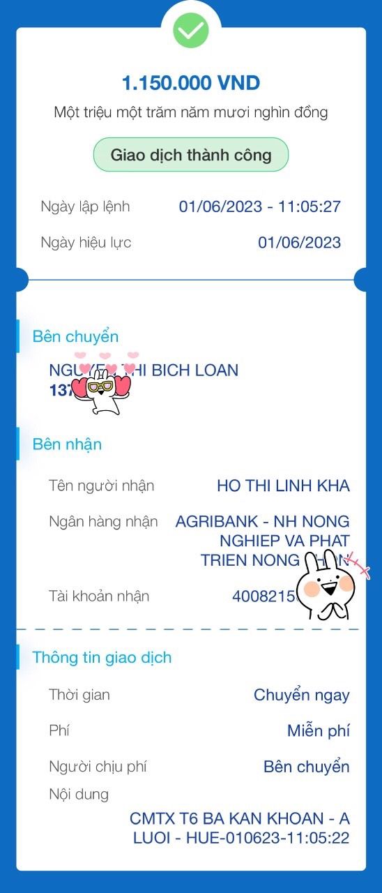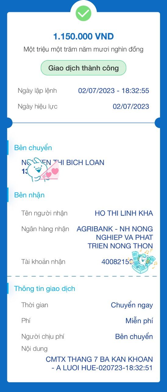 Loannguyen đã chuyển tiền CMTX tháng 7 nhờ Chị Linh Kha chuyển đến bà ạ !