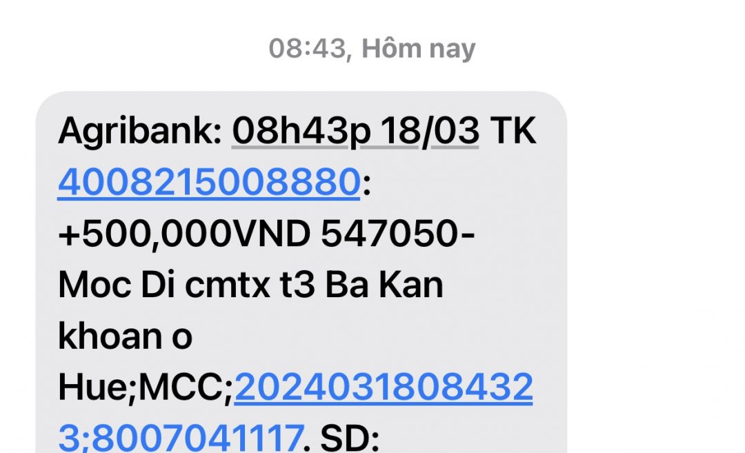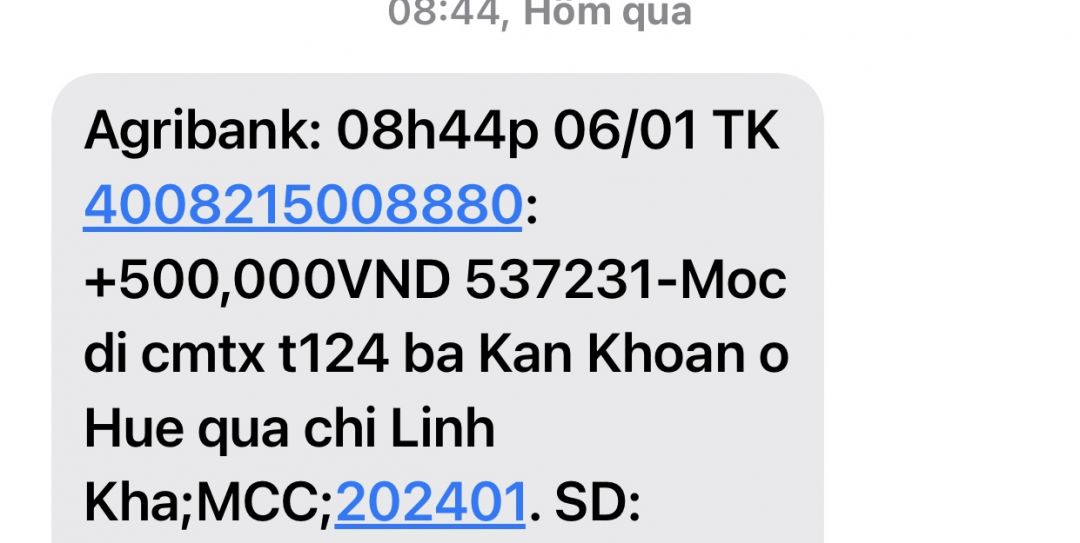 Em có nhận 600.000đ của anh chị Móc Di gửi cho bà Kan Khoan tháng 2/2024 biết ơn anh chị nhiều.