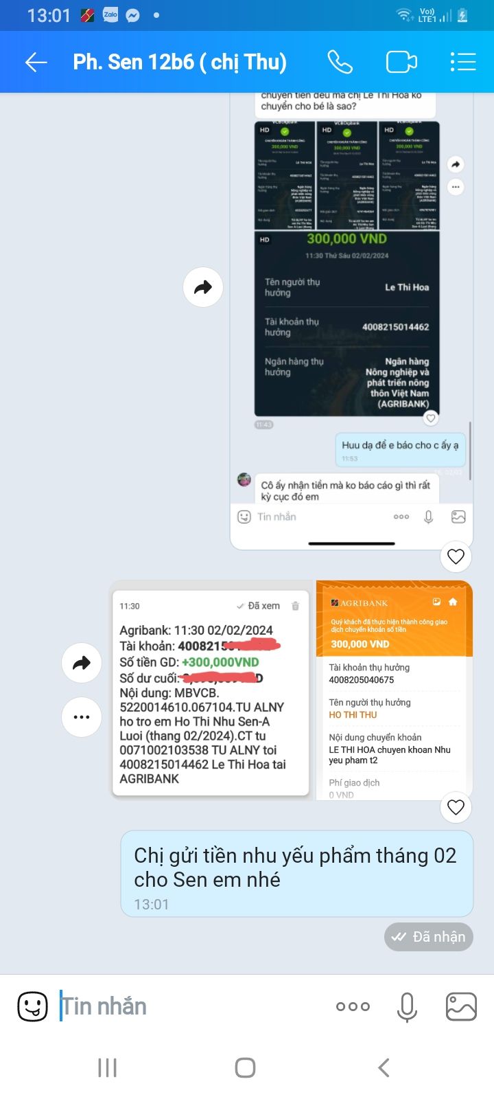 Em đã đã nhận và chuyển số tiền 300k của chị anly đến cô của em Sen cho em mua nhu yếu phẩm tháng 02 / 2024 ạ! Cảm ơm quí ac rất nhiều 🥰🥰🥰