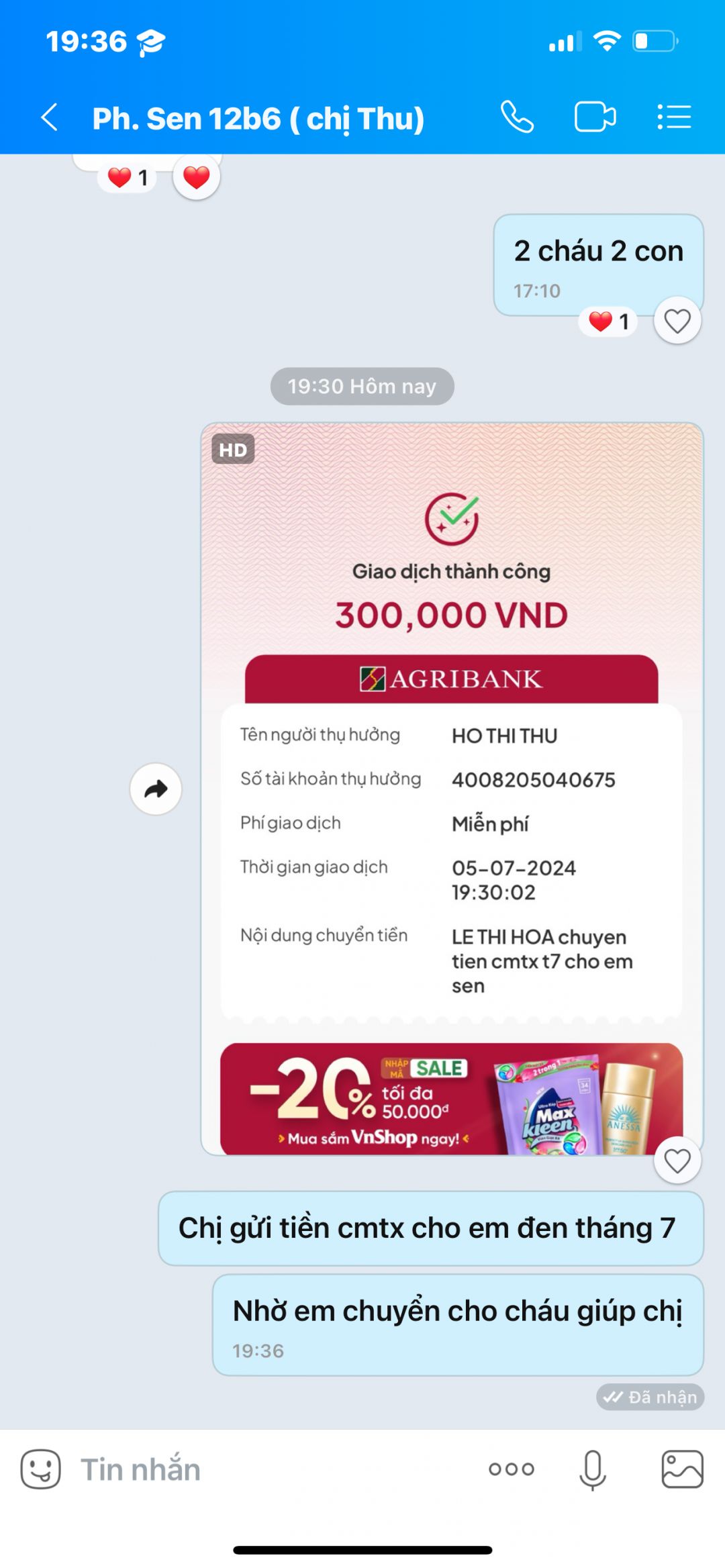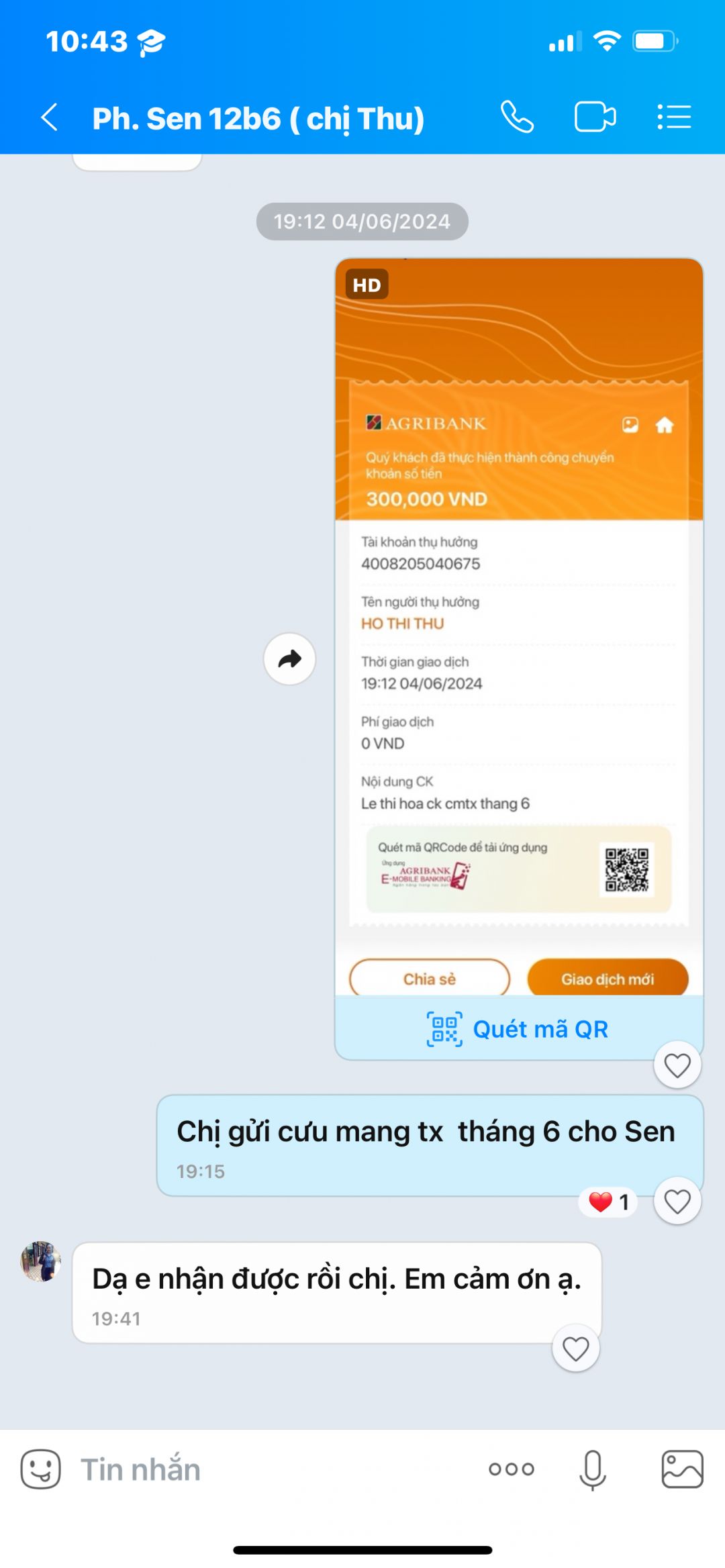 m đã đã nhận và chuyển số tiền 300k của chị anly đến cô của em Sen cho em mua nhu yếu phẩm tháng 04 / 2024 ạ! Cảm ơm quí ac rất nhiều 🥰🥰🥰