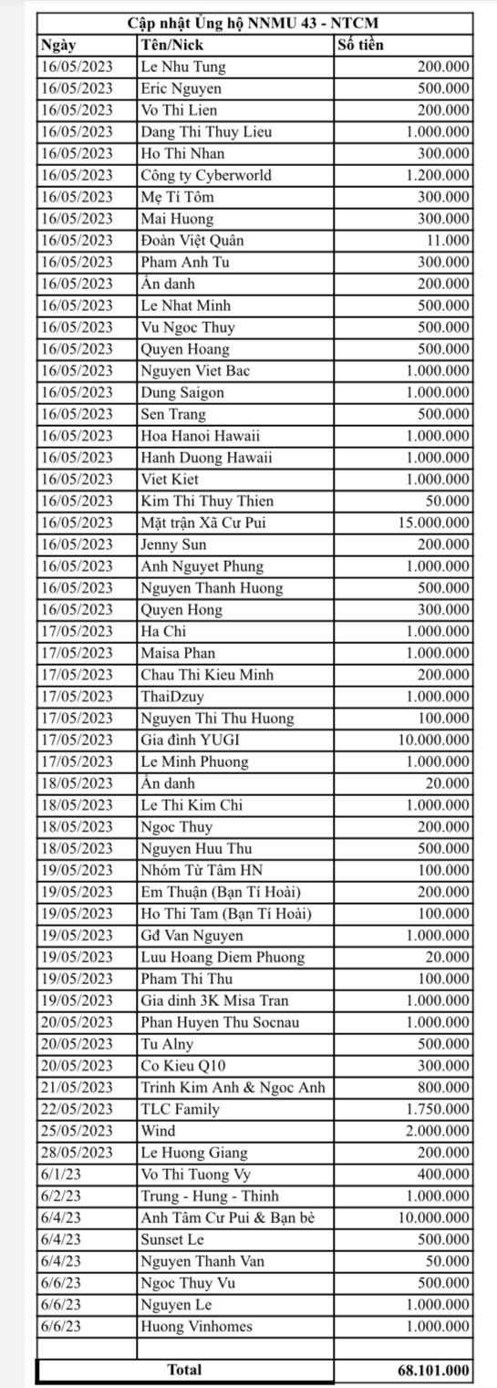 Cập nhật số tiền ủng hộ NNMU43 đến thời điểm hiện tại:68.101.000