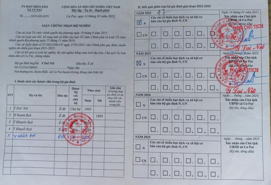 bố ruột của chị bị bệnh tâm thần đang sống lang thang, con trai lớn 2014 cũng bị bệnh tâm thần, hiện tại gia đình chị thu nhập chính bằng ngày công làm thuê của chồng chị là anh Y Dol niê sinh năm 1985.căn nhà hiện tại rách nát, không thể che mưa nắng.... cuộc sống quá cơ cực, nghèo khó!!!