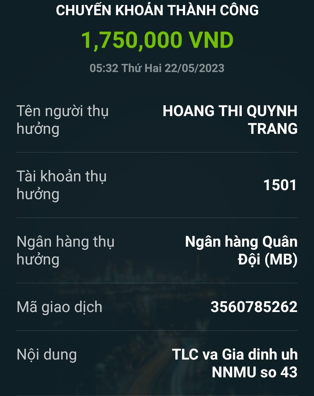 Chị Yến có nhờ em Wendy ck 5 triệu đồng ủng hộ NNMU 43 ạ!