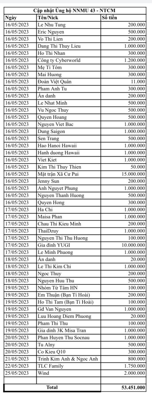 Cập nhật số tiền ủng hộ NNMU43 đến thời điểm hiện tại là 53.451.000