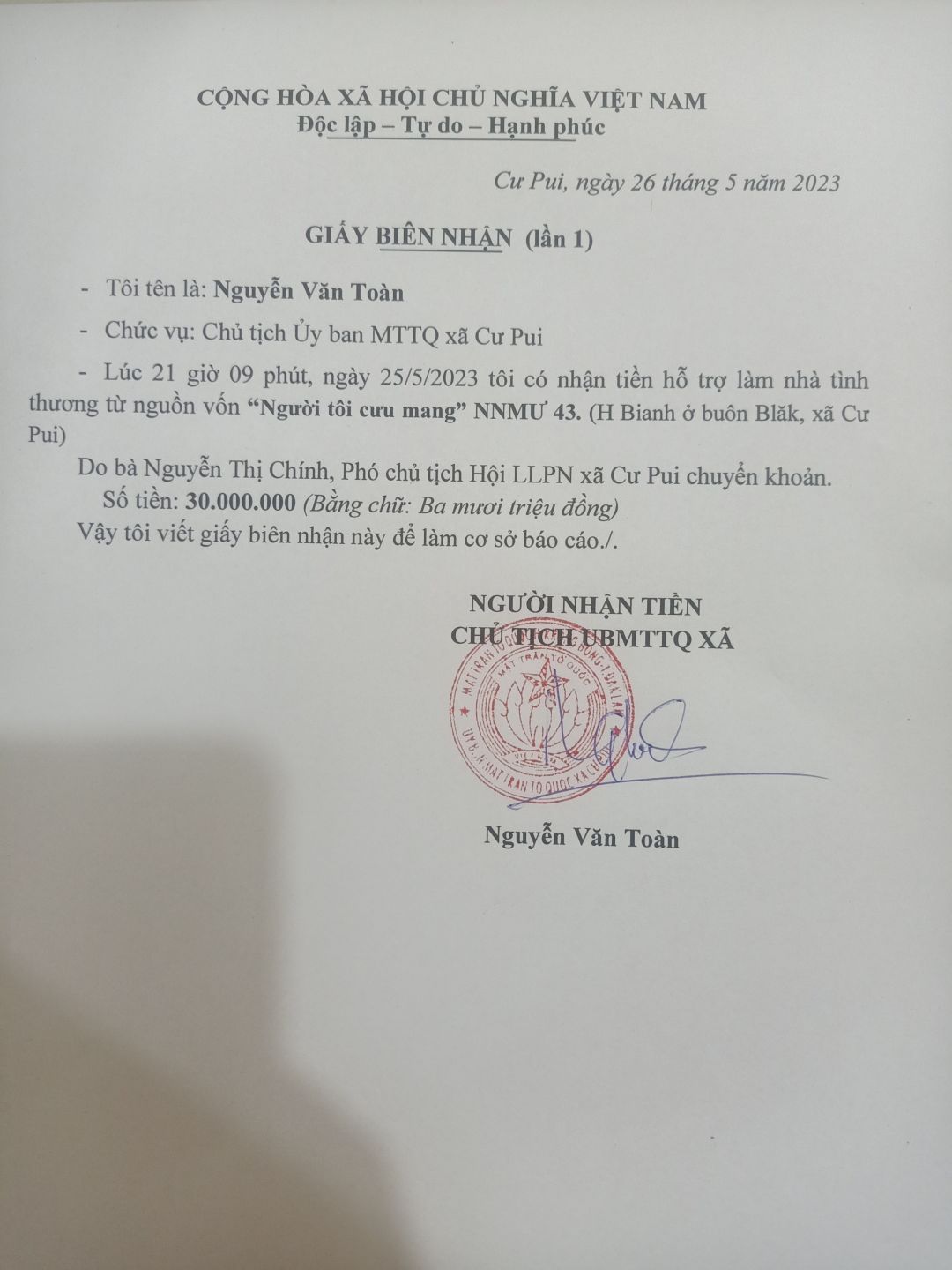 Em đã nhận được 30 triệu đồng từ NTCM, và đã chuyển đủ số tiền này cho chủ tịch UBMT xã để trả cho bên cung cấp vật liệu đợt đầu ạ.