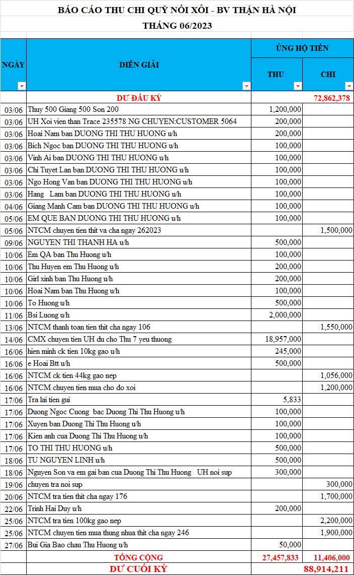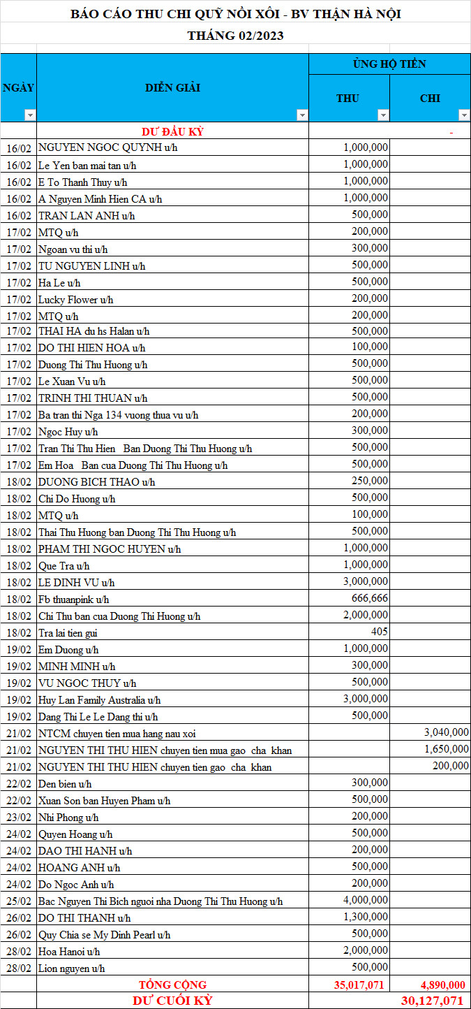Em xin gửi thống kê số liệu của Nồi Xôi - Bệnh viện Thận Hà Nội, từ tháng 02/2023 đến tháng 06/2023.