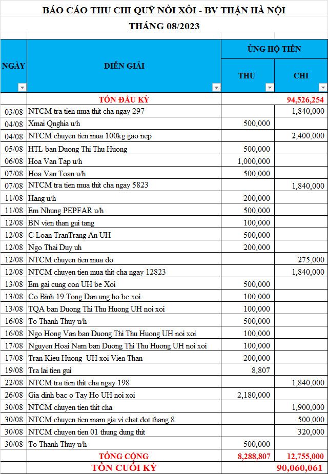 Em xin gửi thống kê số liệu của Nồi Xôi - Bệnh viện Thận Hà Nội tháng 08/2023.