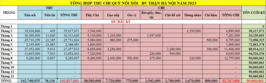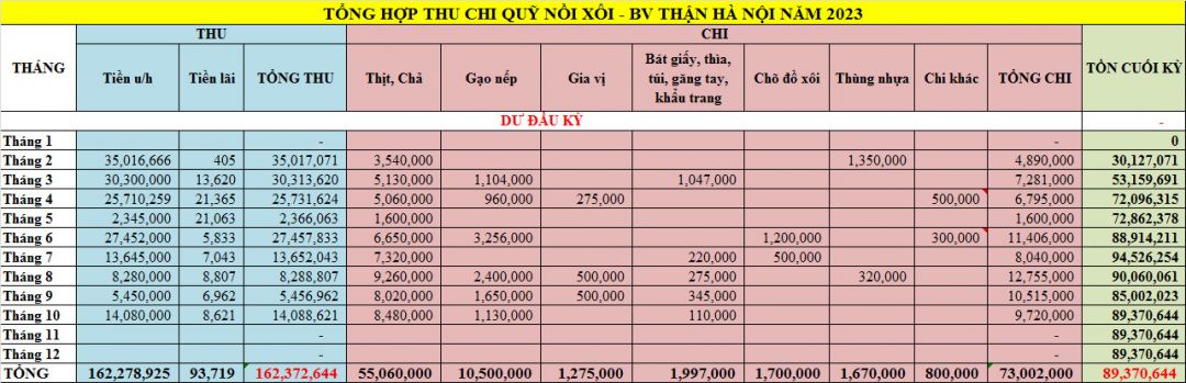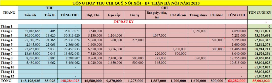 Em xin gửi thống kê số liệu của Nồi Xôi - Bệnh viện Thận Hà Nội tháng 11+12/2023 và tổng hợp thu - chi, ủng hộ hiện vật cả năm 2023 như sau: